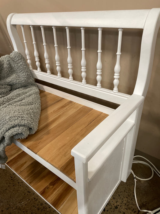 White bench with natural wood slat seat
