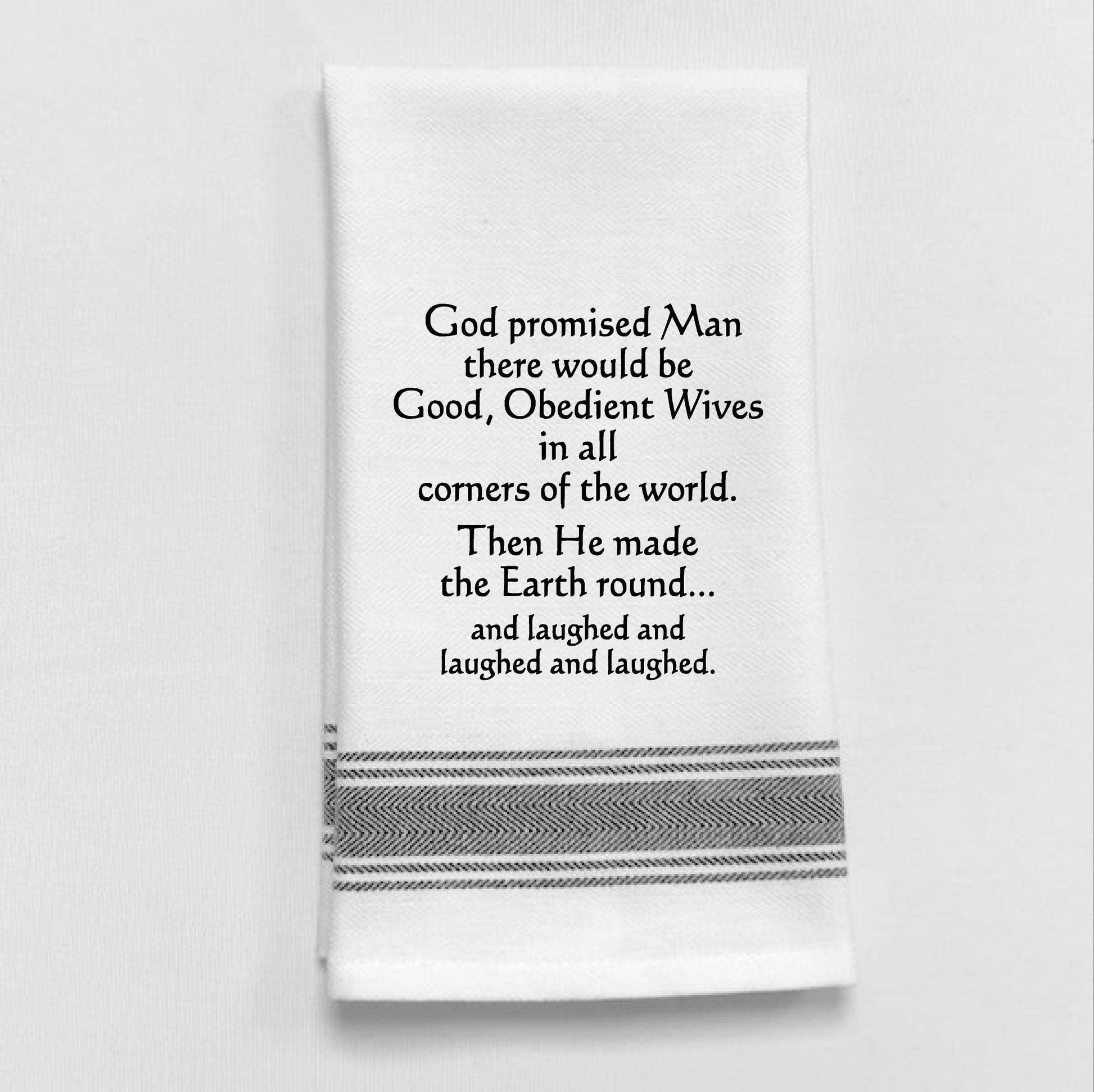 WHITE - BLACK LINED TRIM"God promised Man there would be Good Obedient Wives in all corners of the world. Then He made the Earth round... and laughed and laughed and laughed."