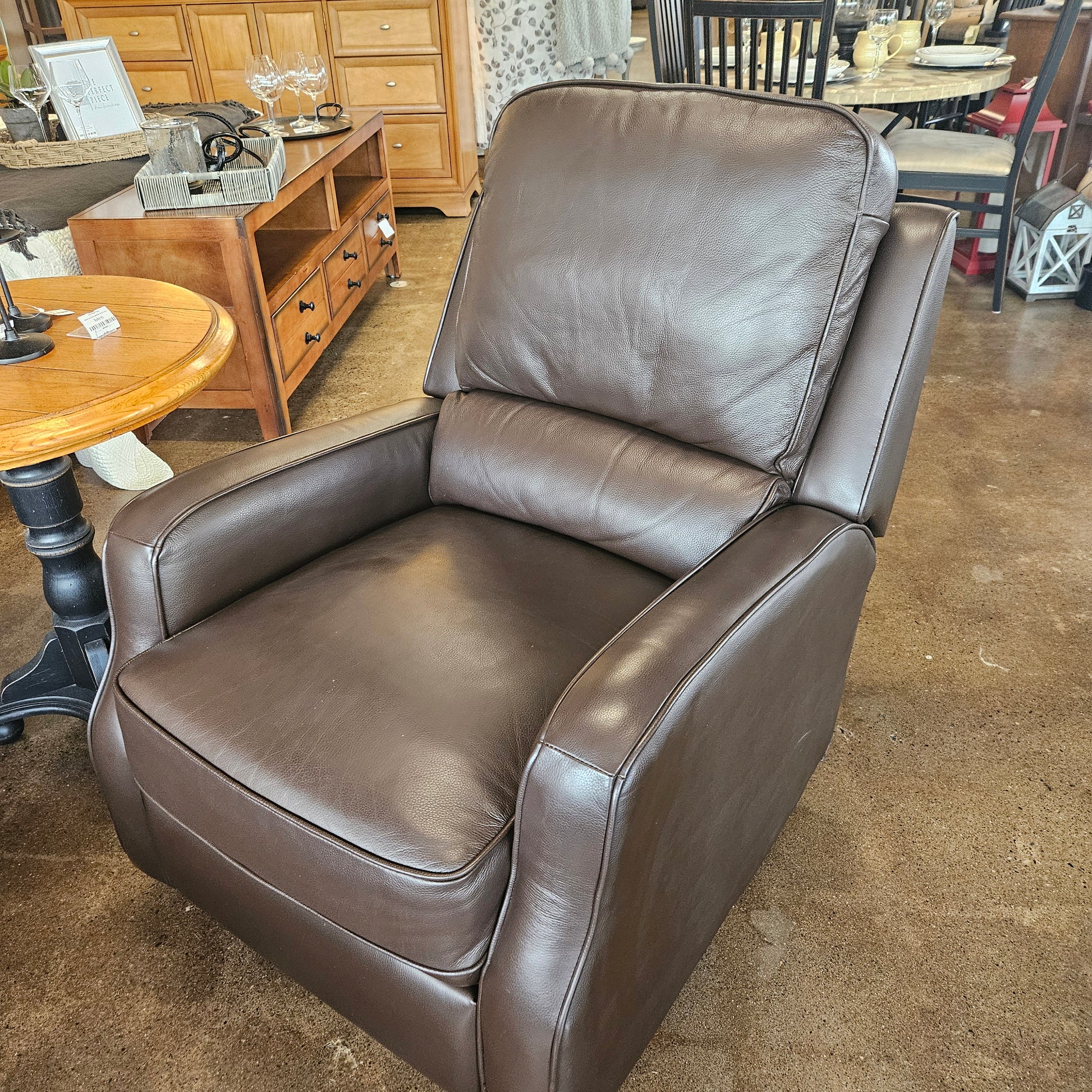 Dark brown leather-like chair with foot rest that flips out the bottom and rocks