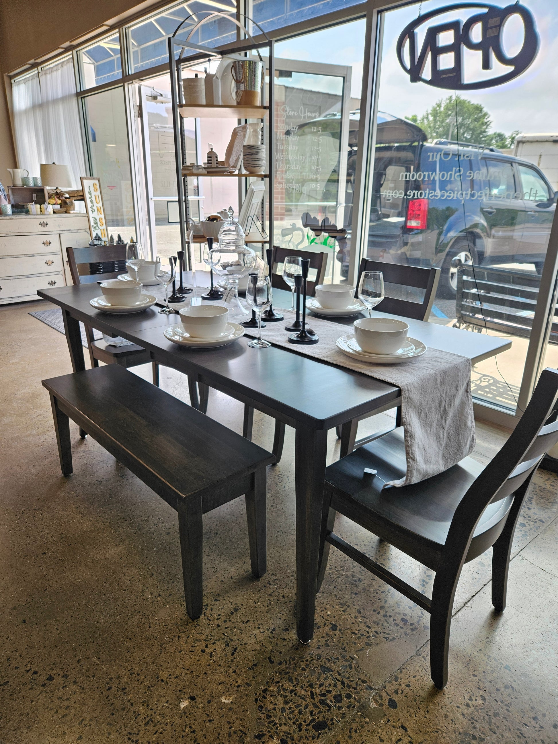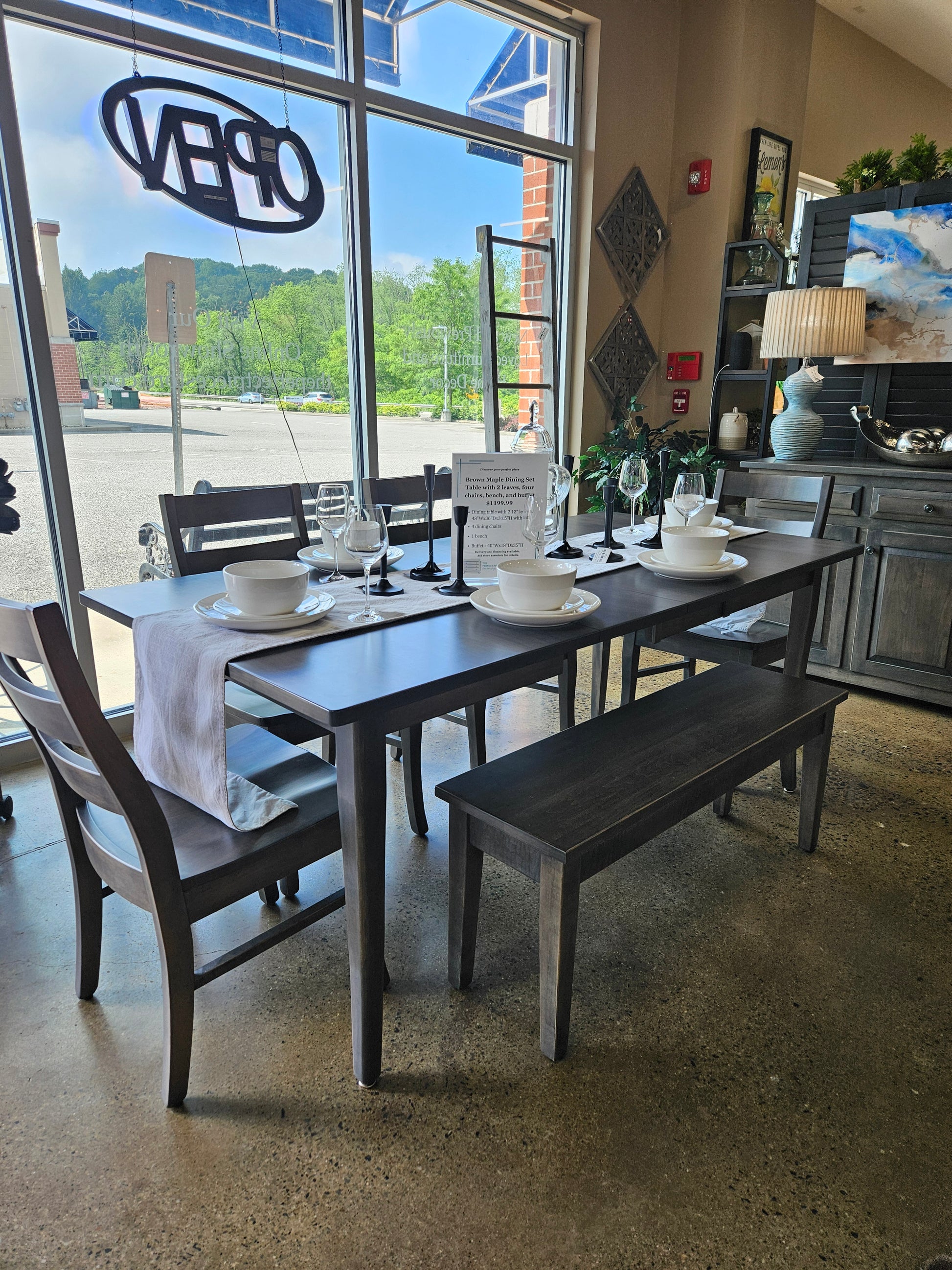 Includes dining table with 2 12" leaves, 4 chairs, 1 bench