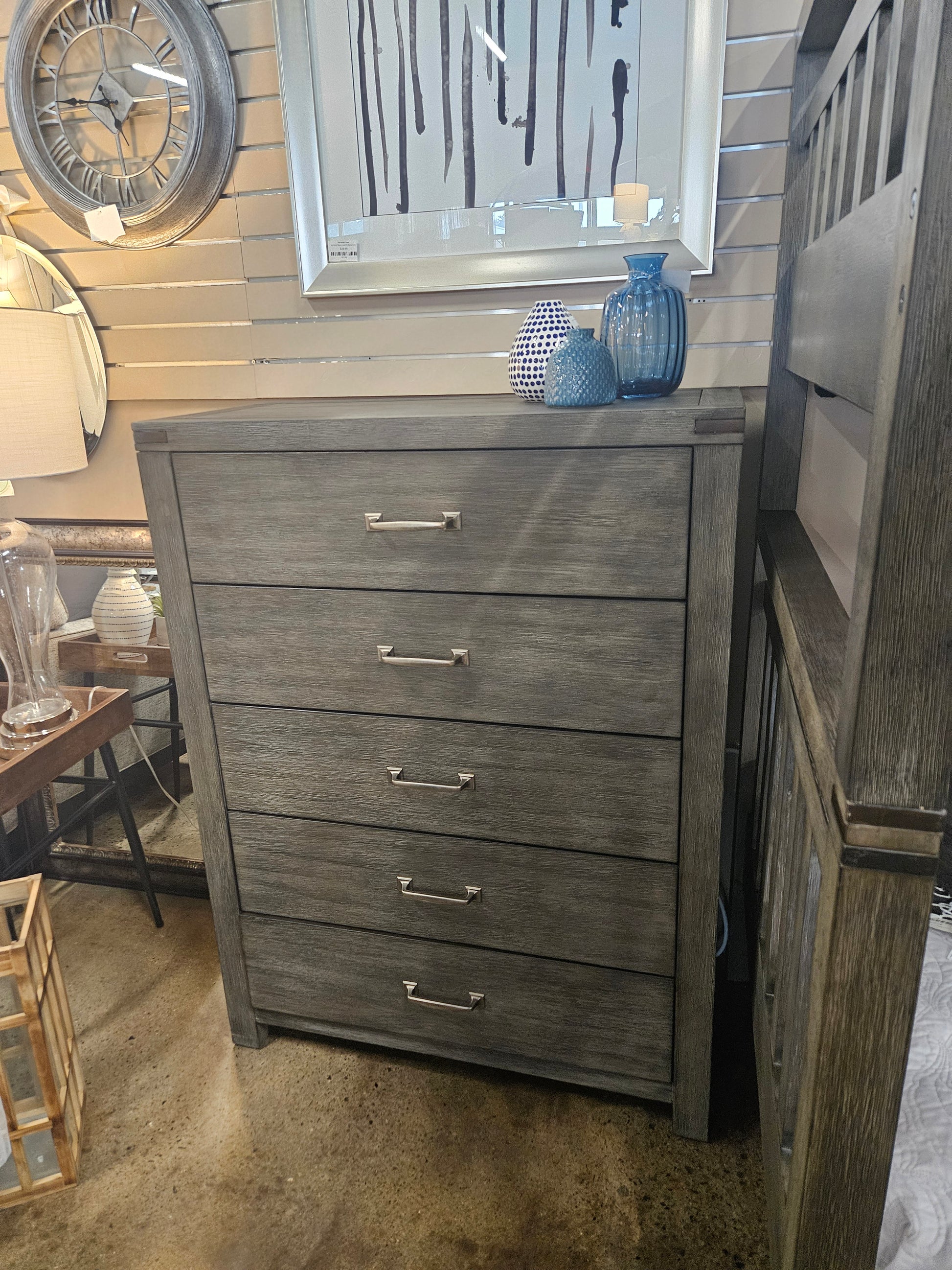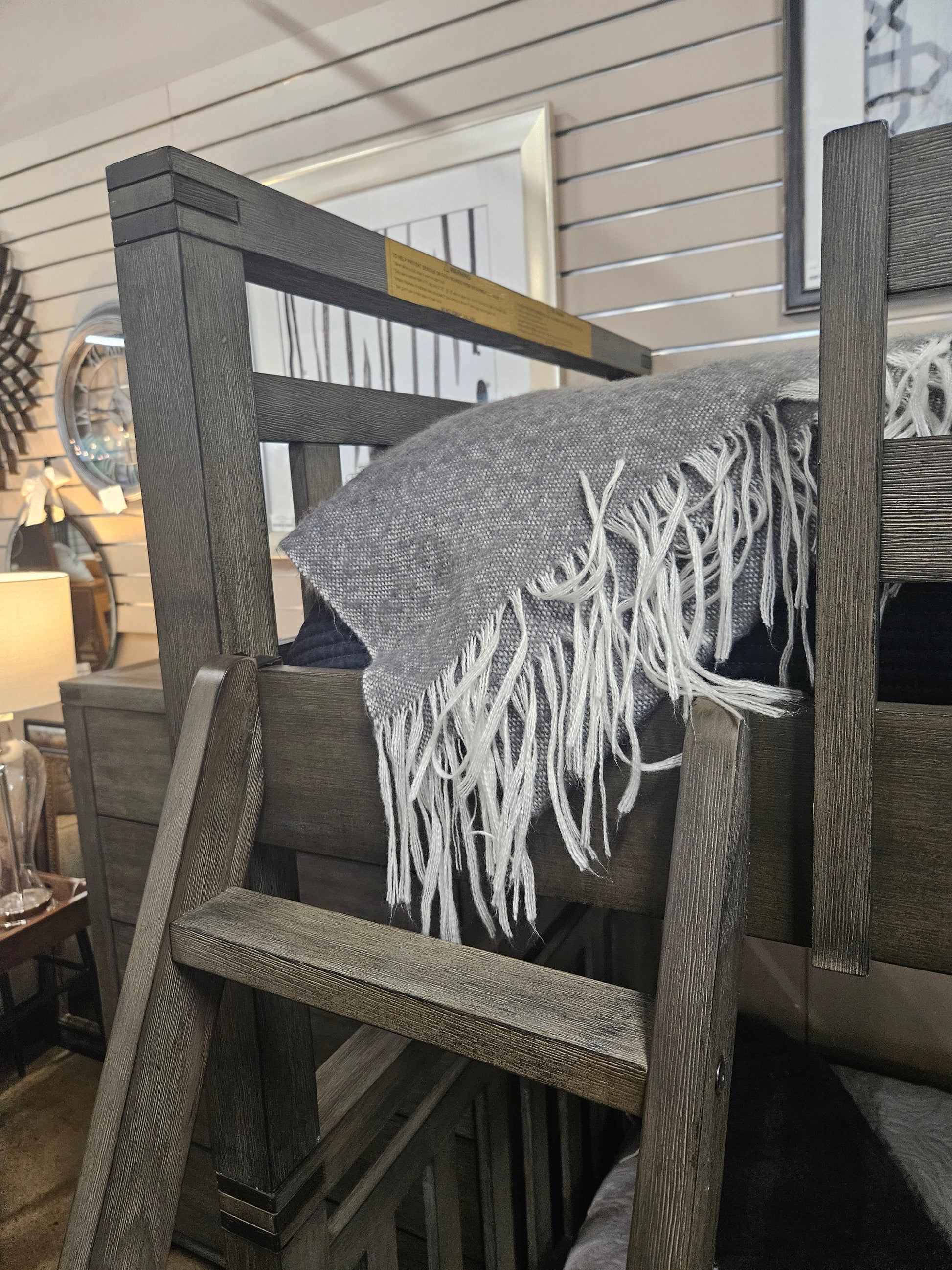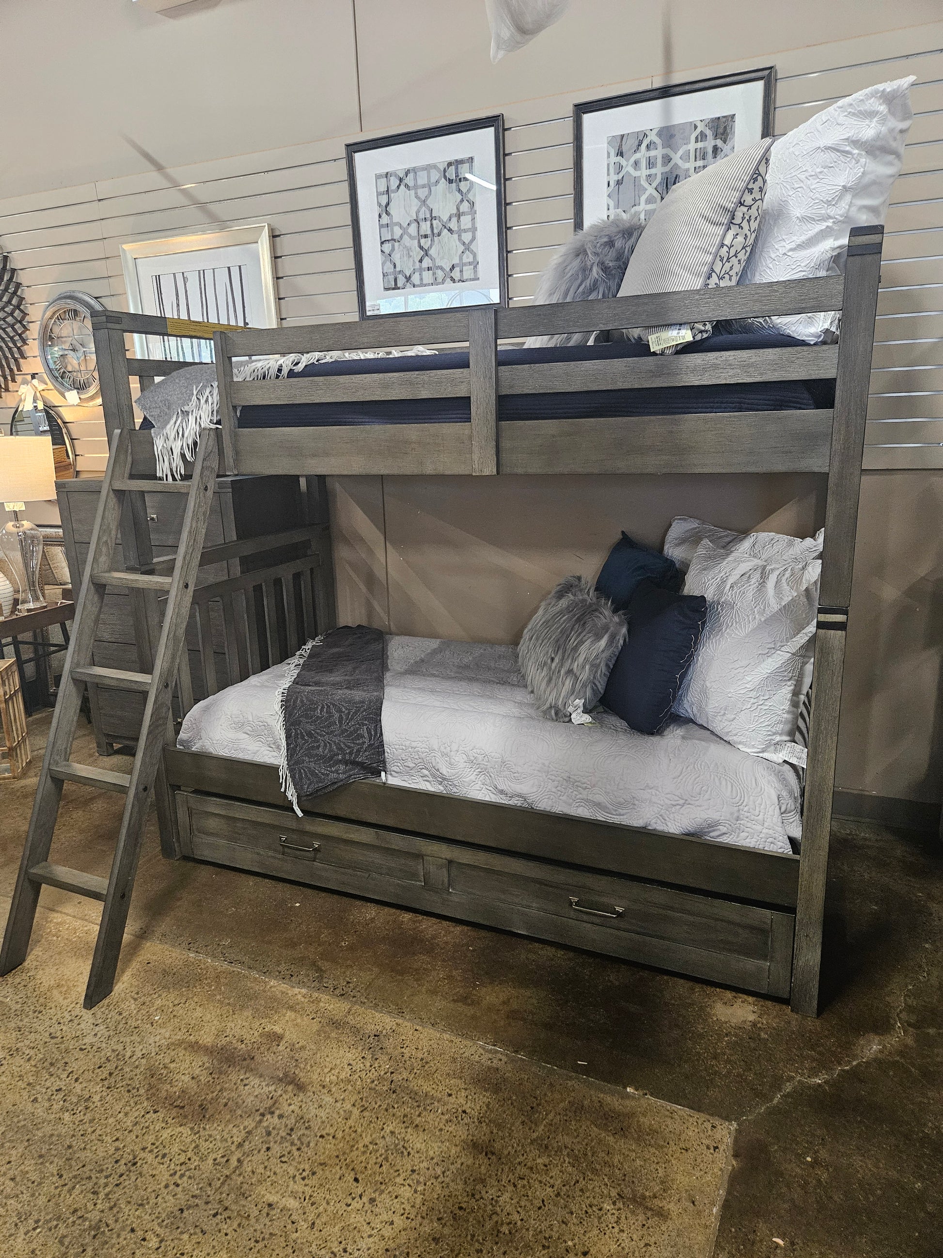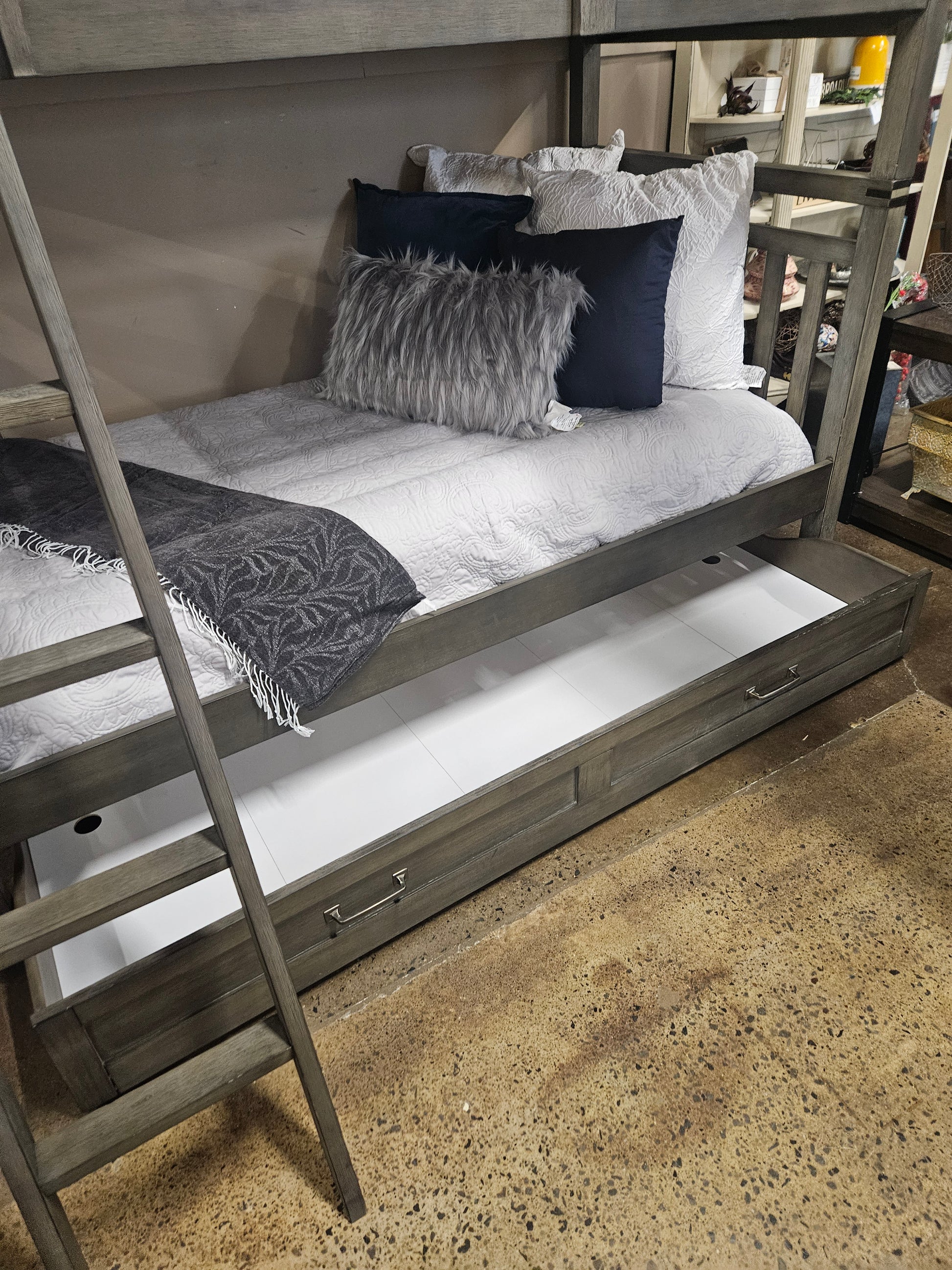 Set includes 2 twin bunk beds, 1 trundle for more bedding or storage, ladder, chest and nightstand.