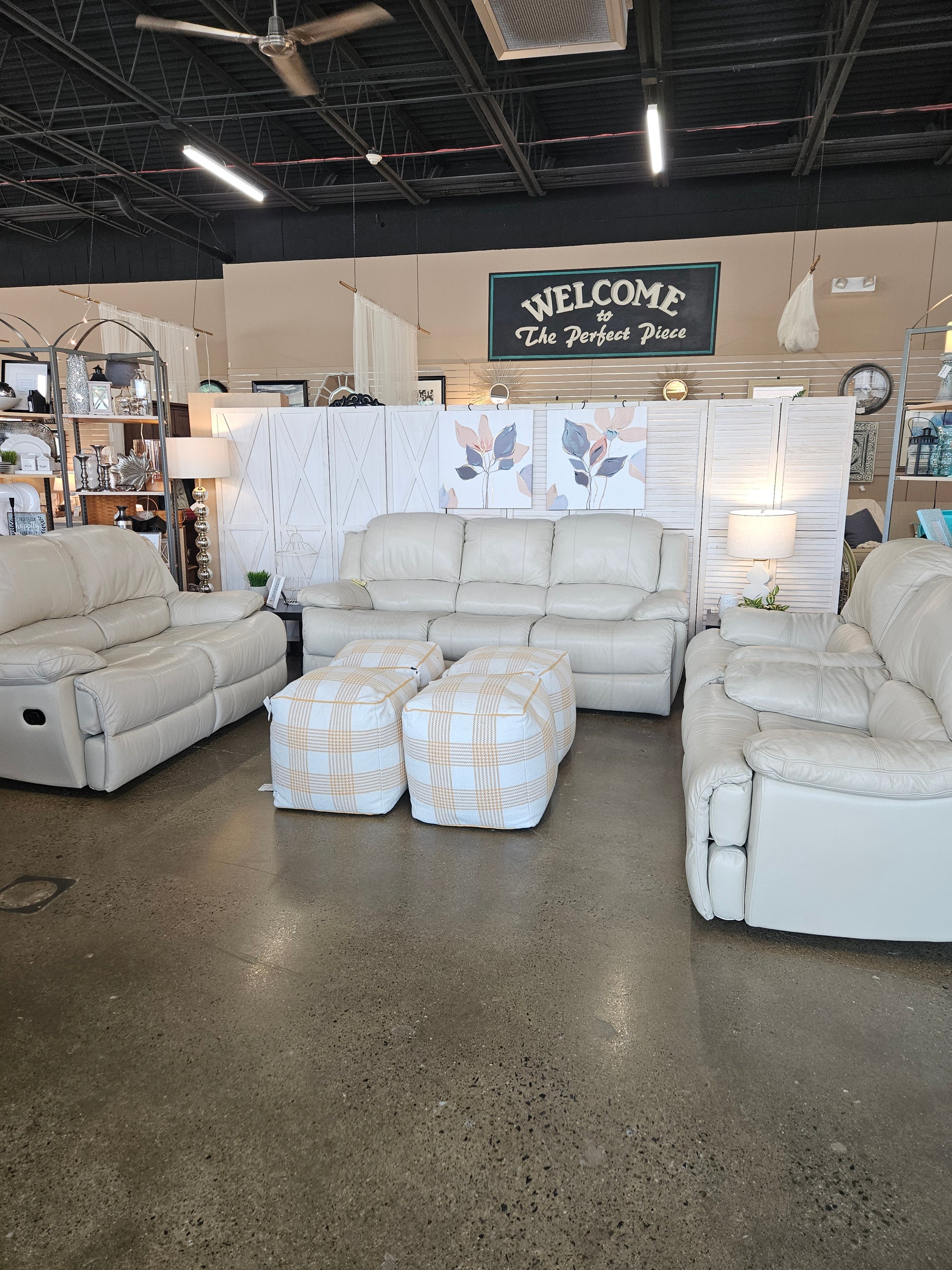 Barely used cream manually reclining sofa. Has two matching recliners.