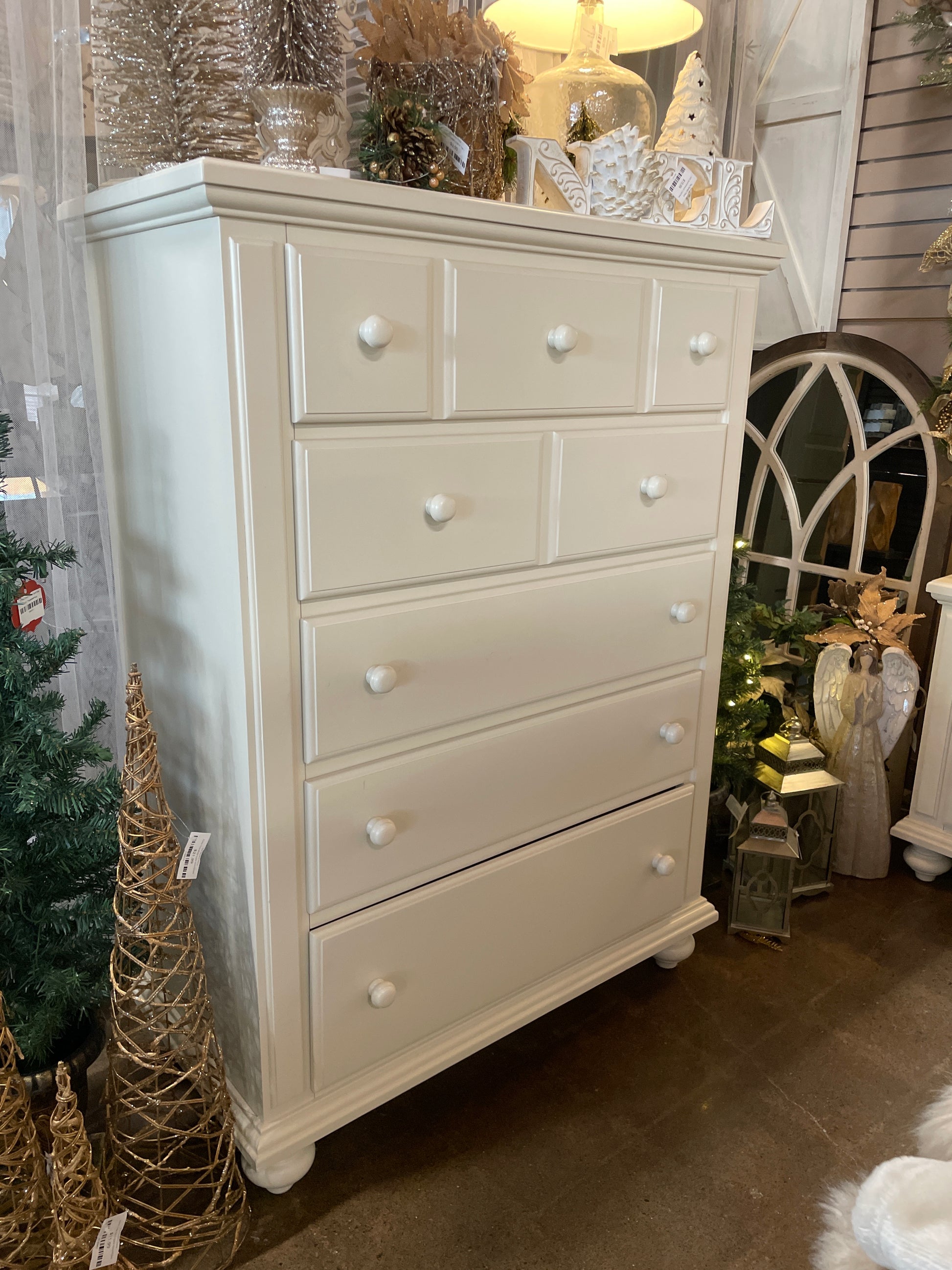 Seabrooke Cream Queen Bedset includes headboard, footboard, side rails, 5 drawer chest and 1 nightstand