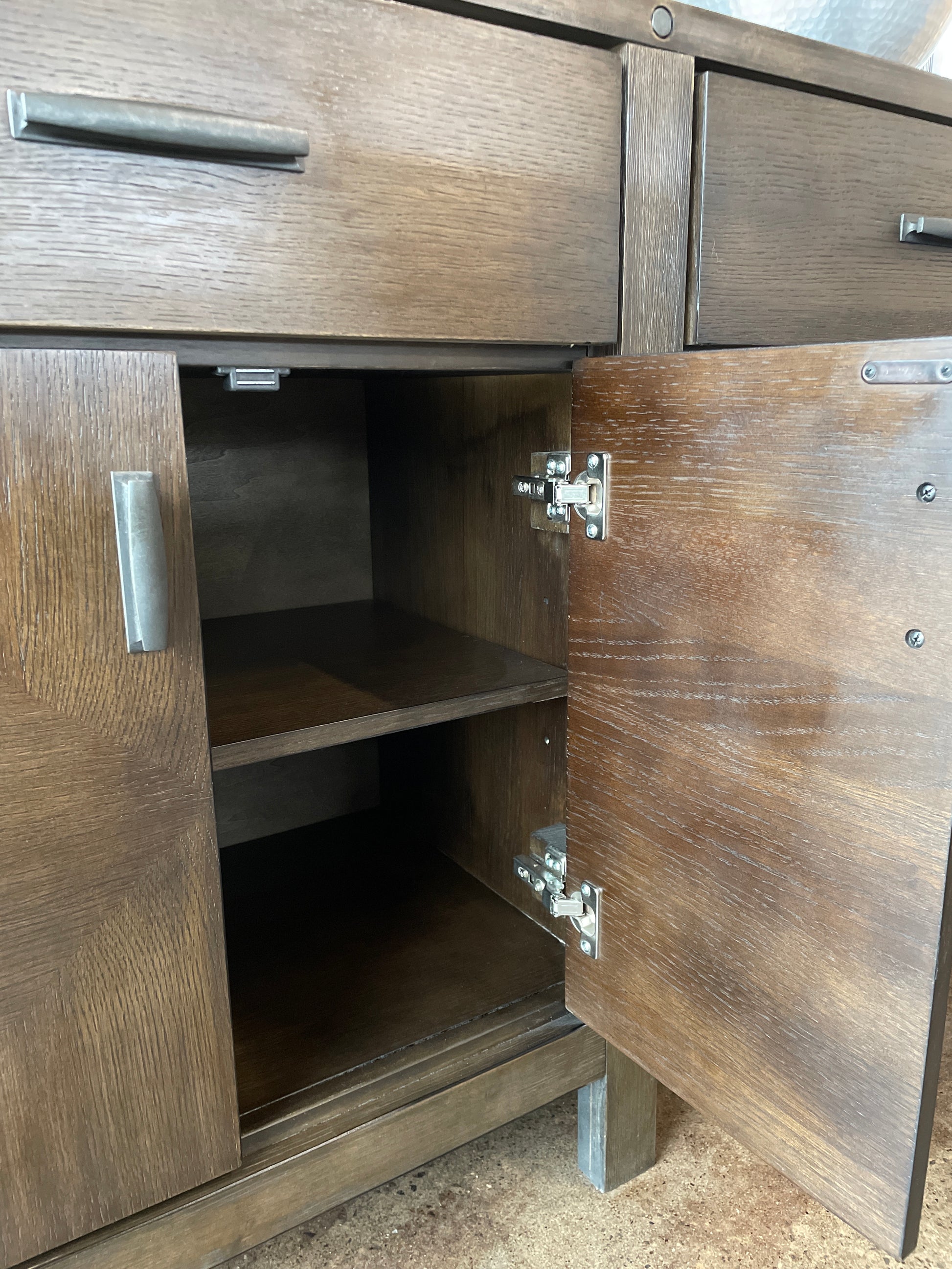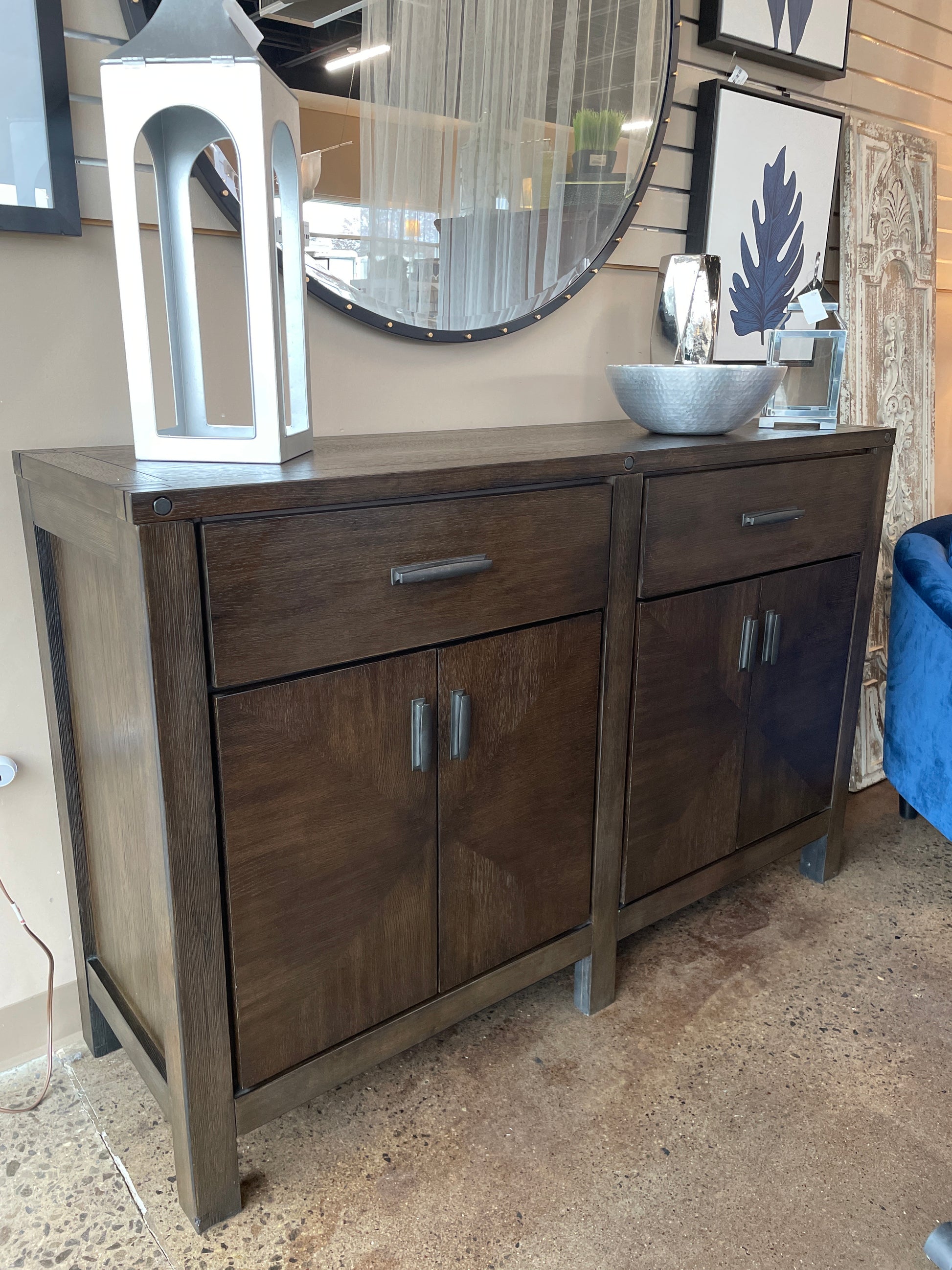 Made of wood, veneer and engineered wood with a rich dark brown finish and diamond matched veneer inlay, including two roomy cabinets and two smooth- gliding drawers.