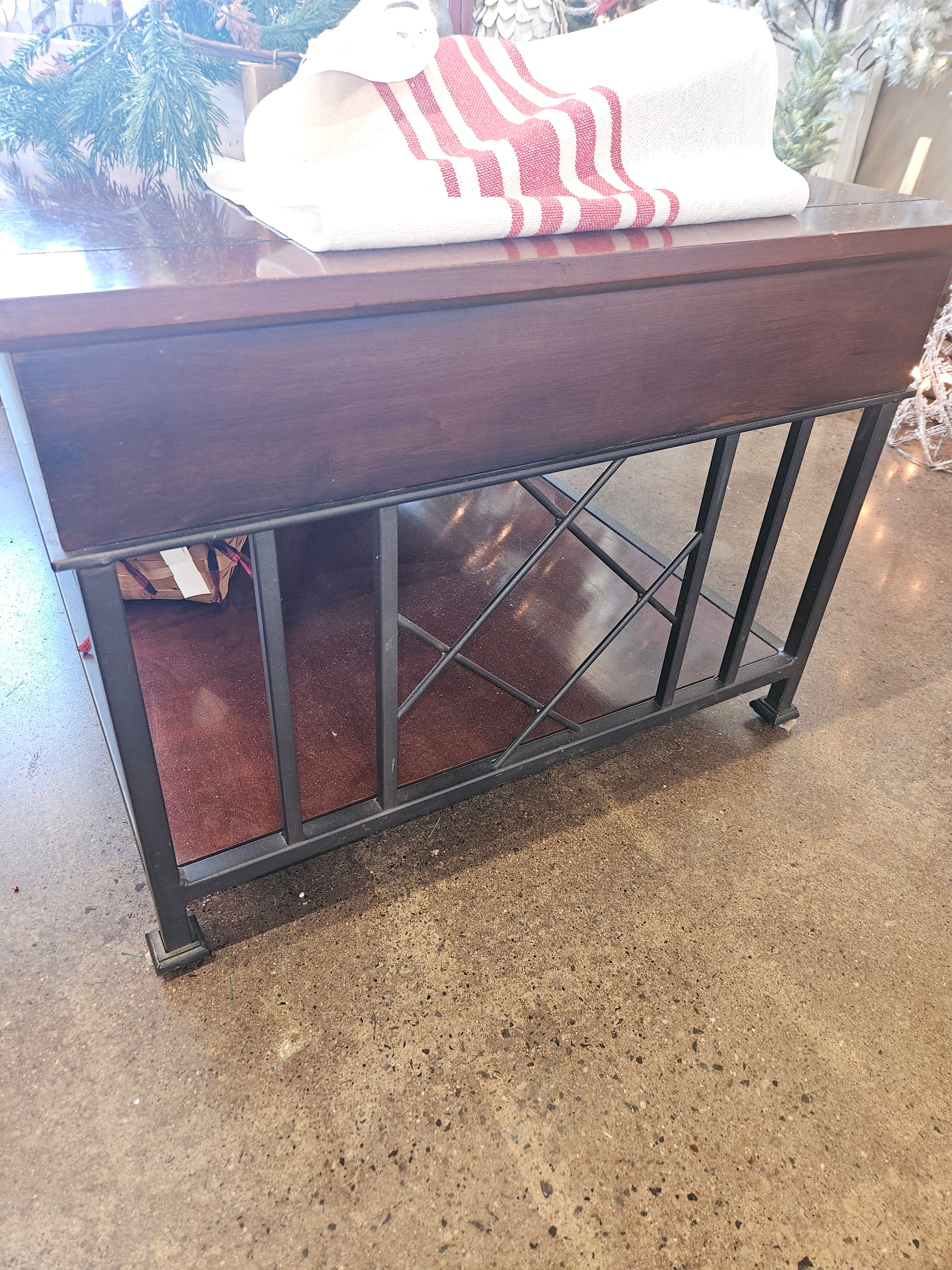 Dark wood coffee table with metal legs and drawer