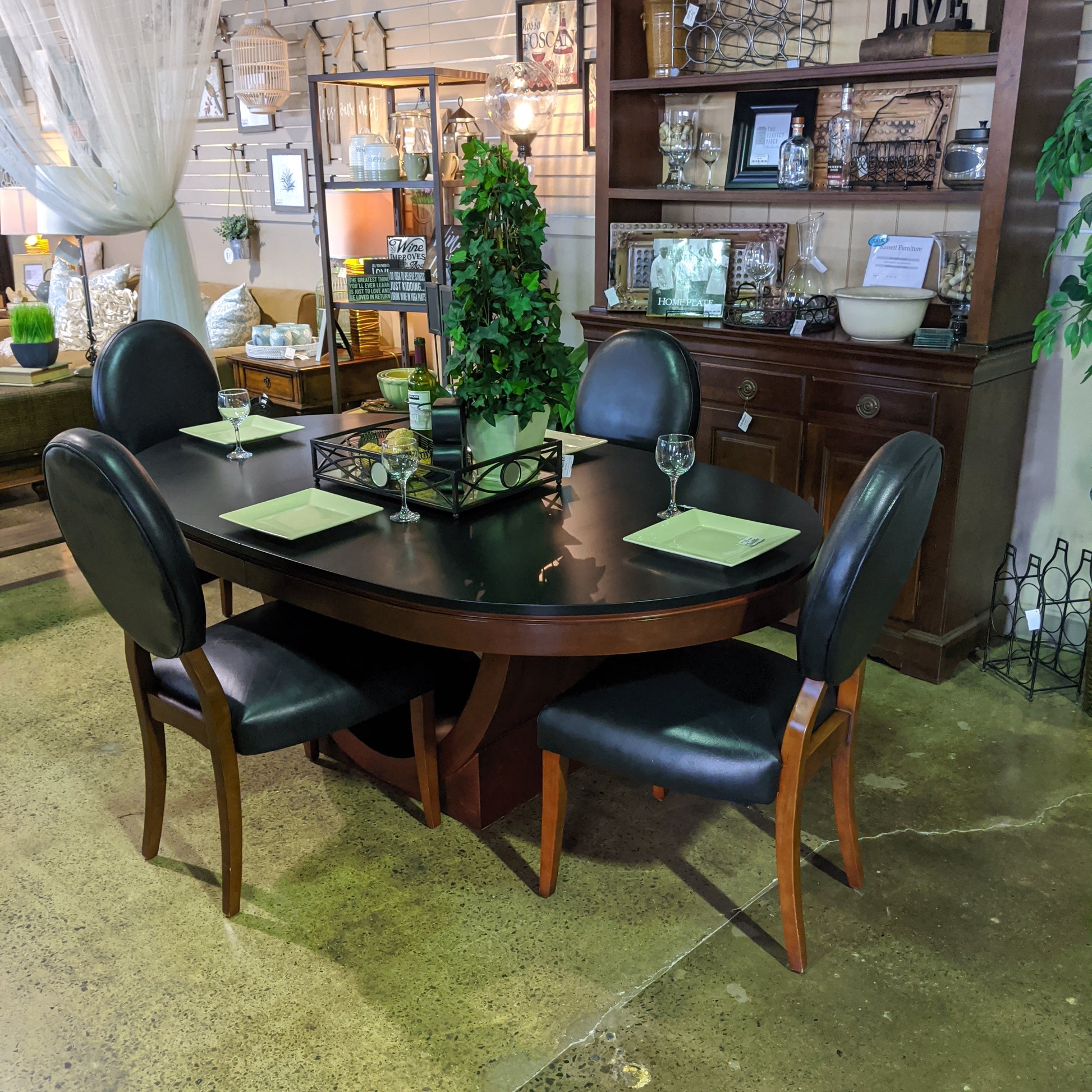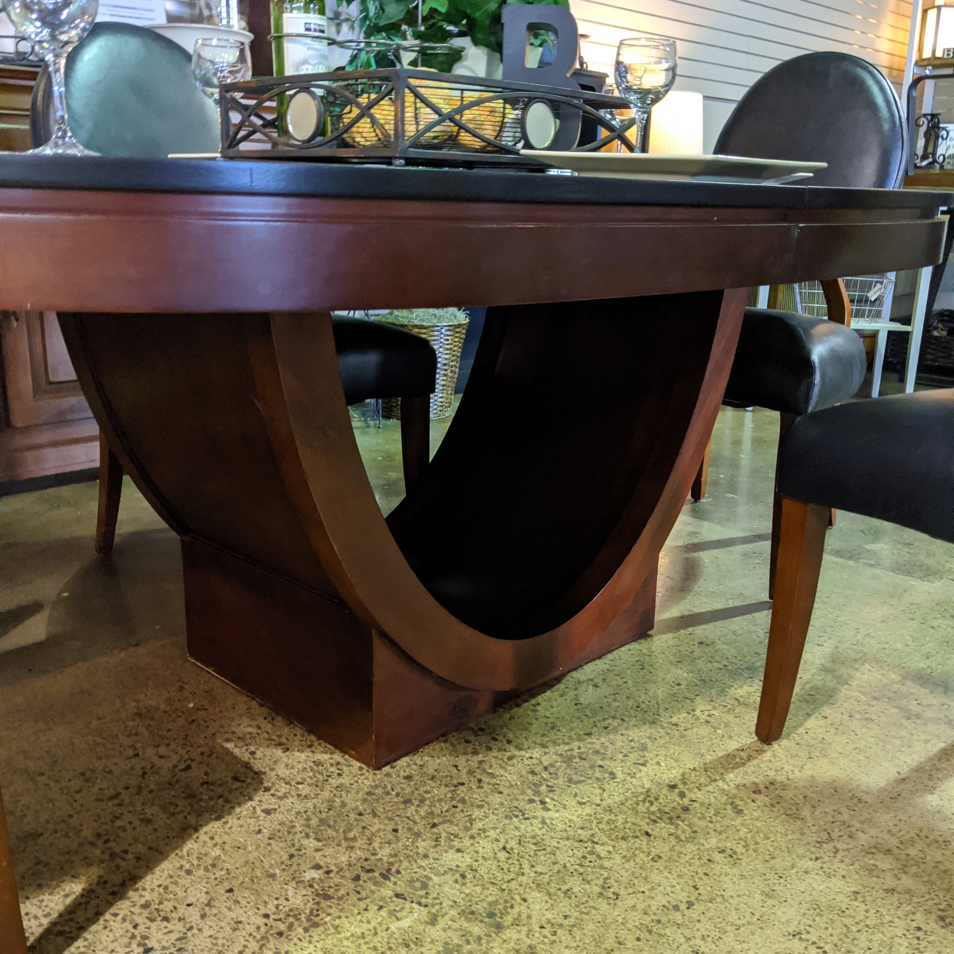 Dark brown stain with black table top and 2 tone chairs.