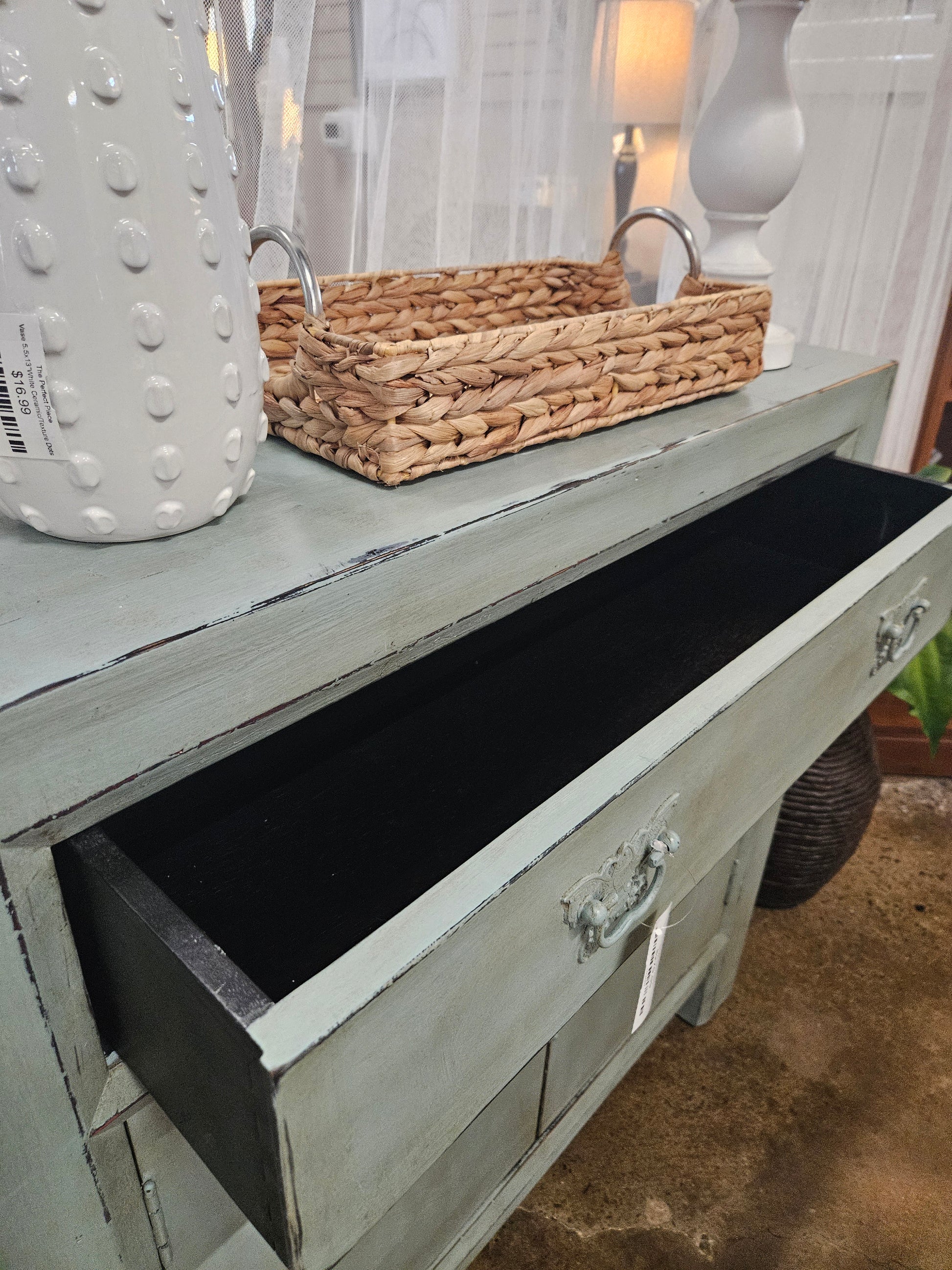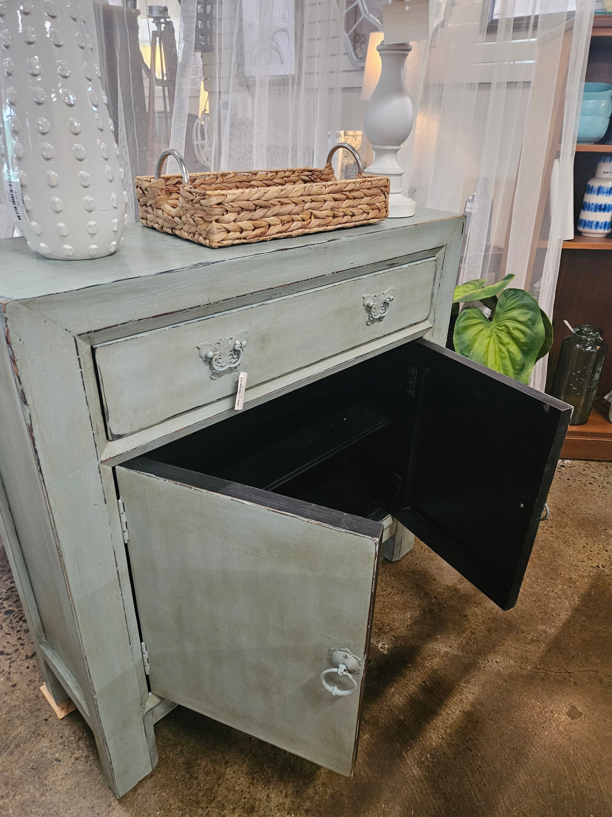 Painted Hooker cabinet in Duck Egg Blue. Has top drawer and lower cabinet for storage.