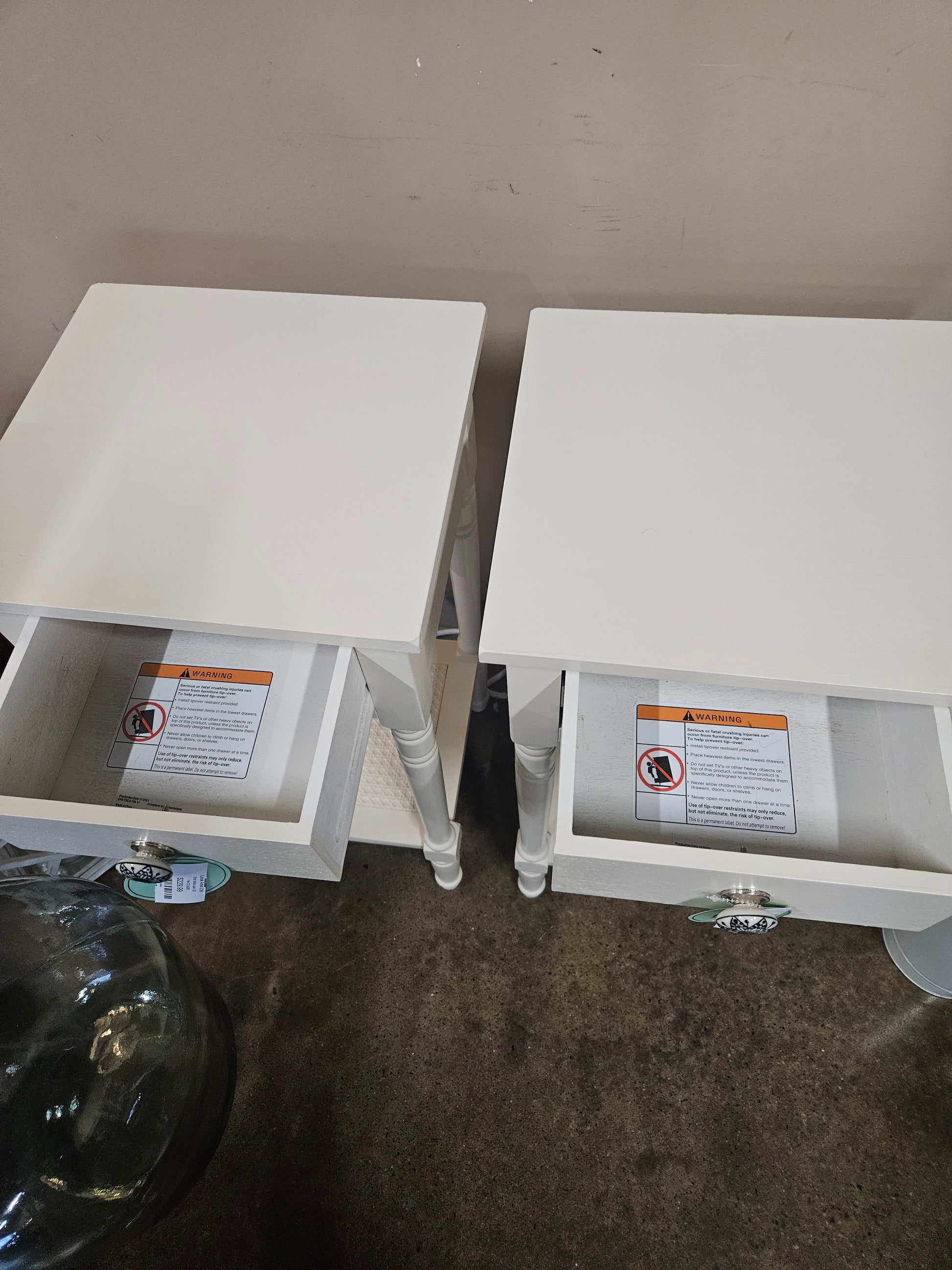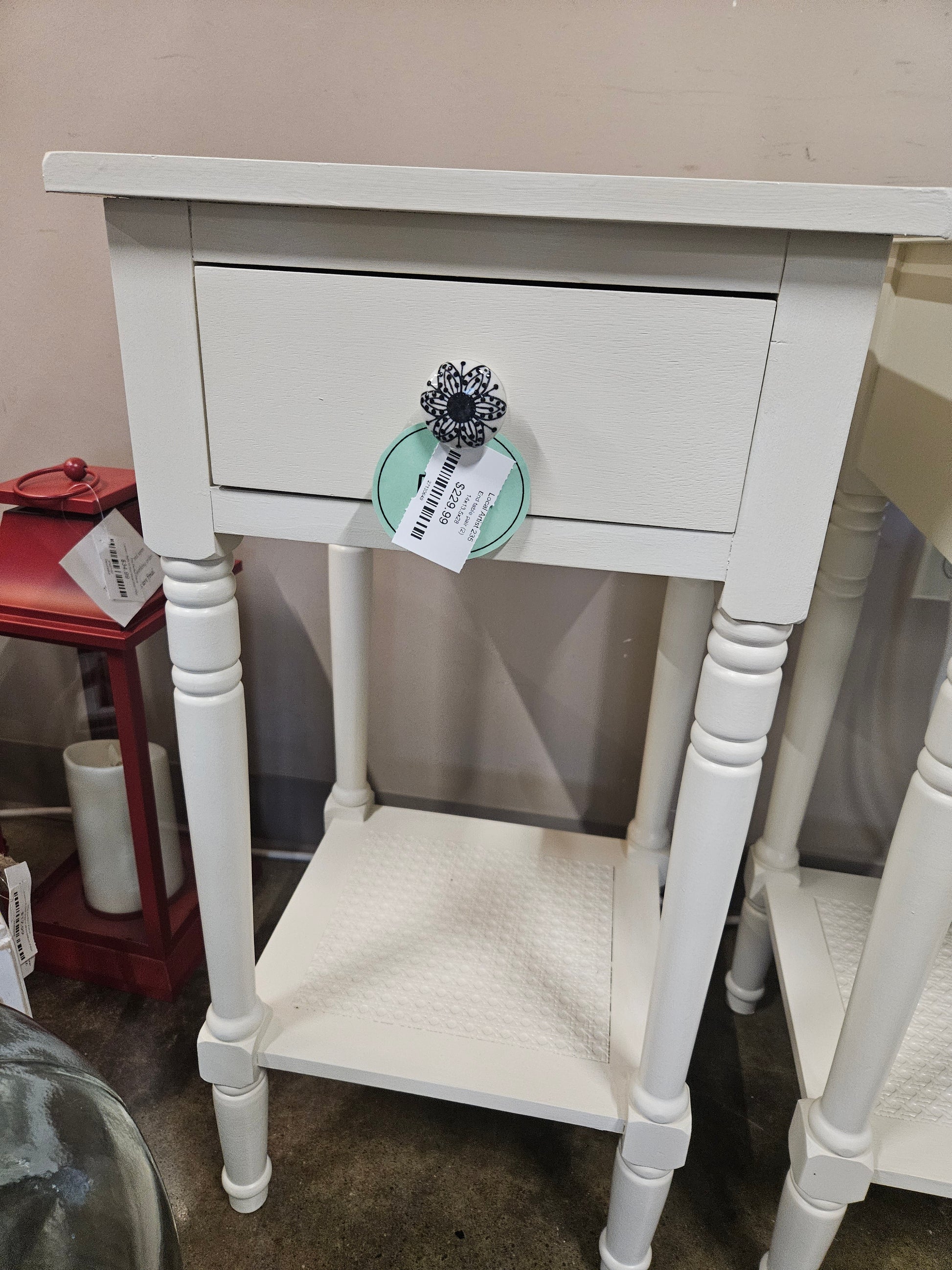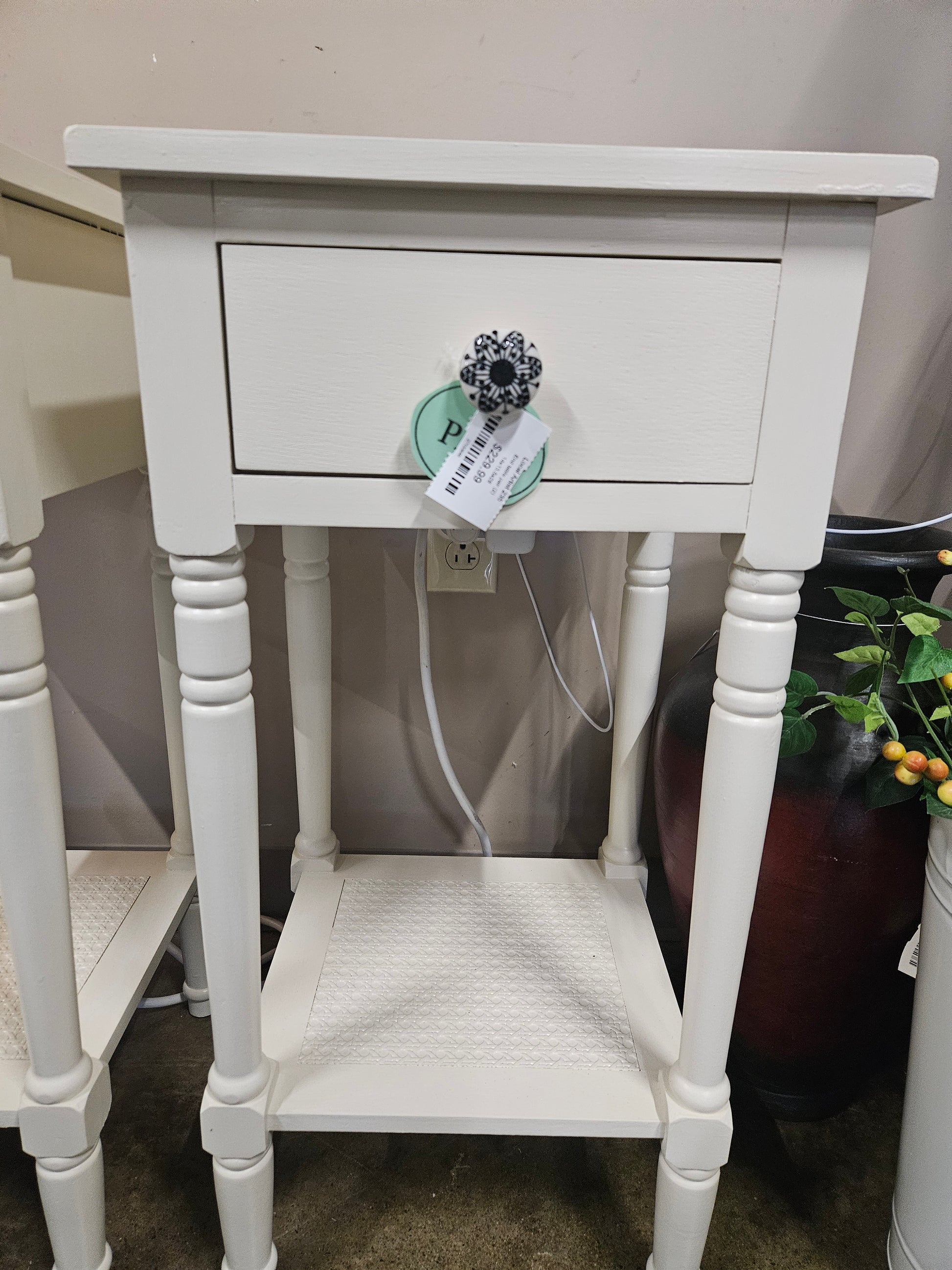 Pair of white end tables with one shelf and one drawer each