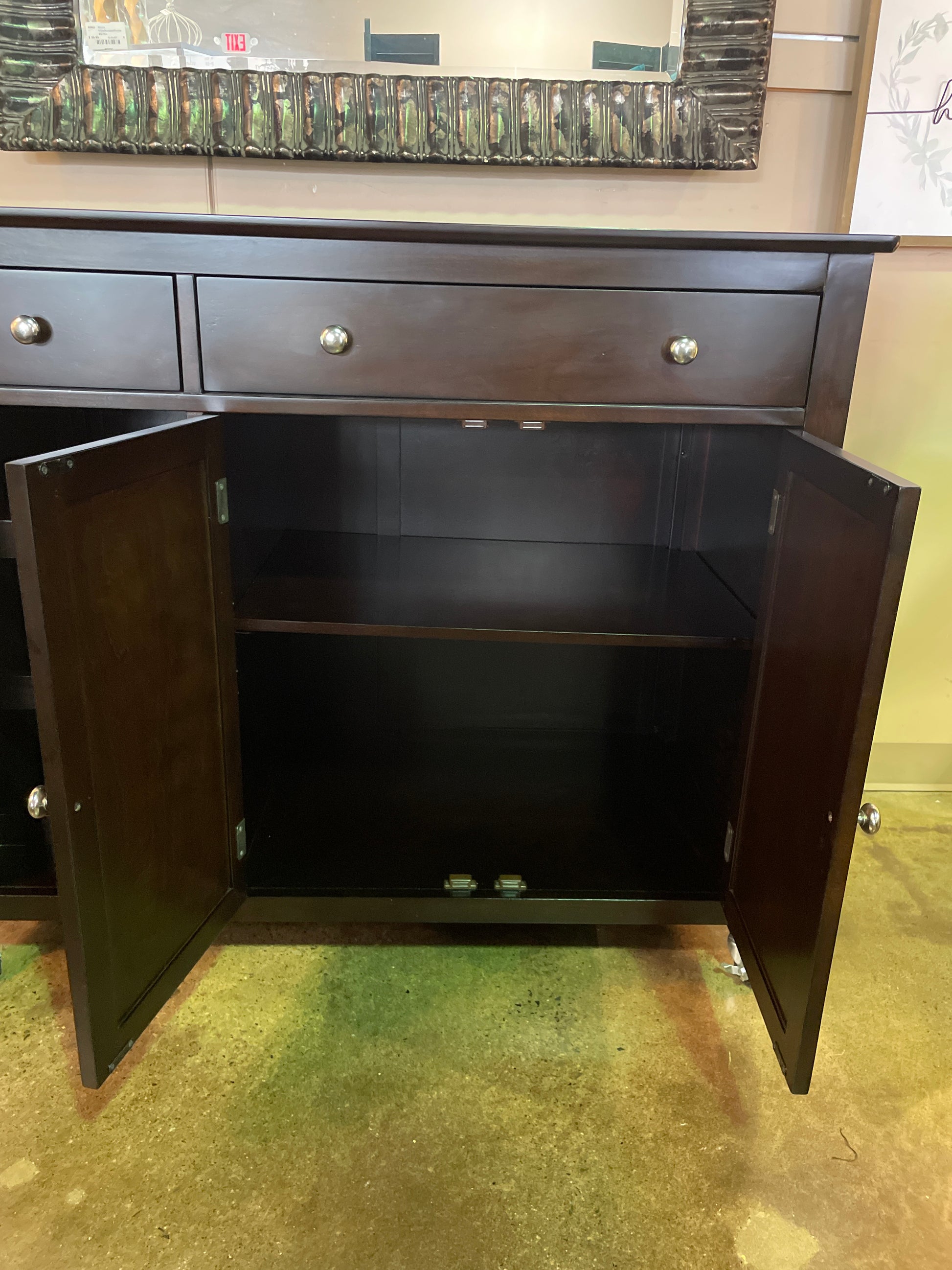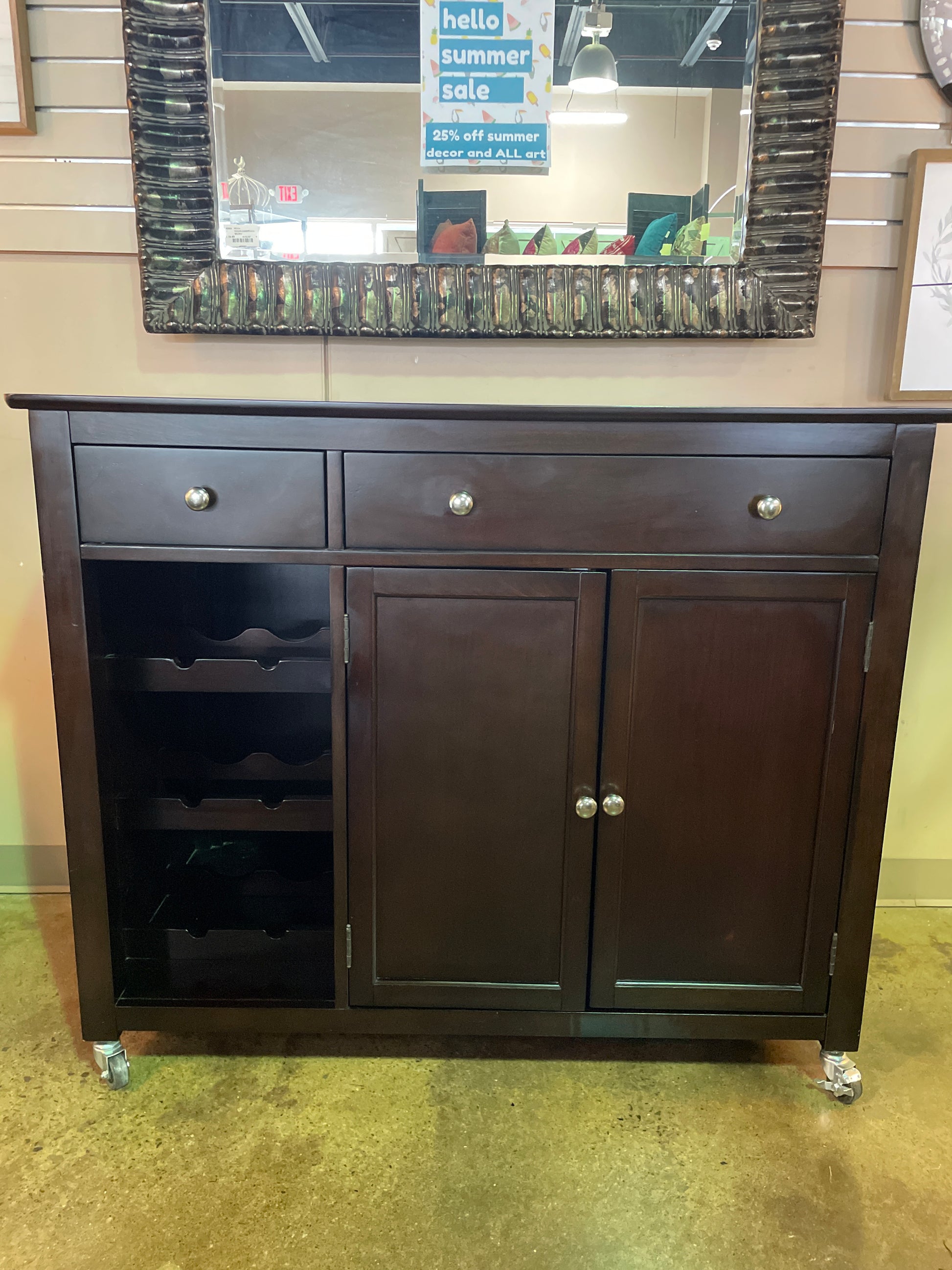 Two Sided Espresso Wood Cabinet with Storage and Caster Wheels