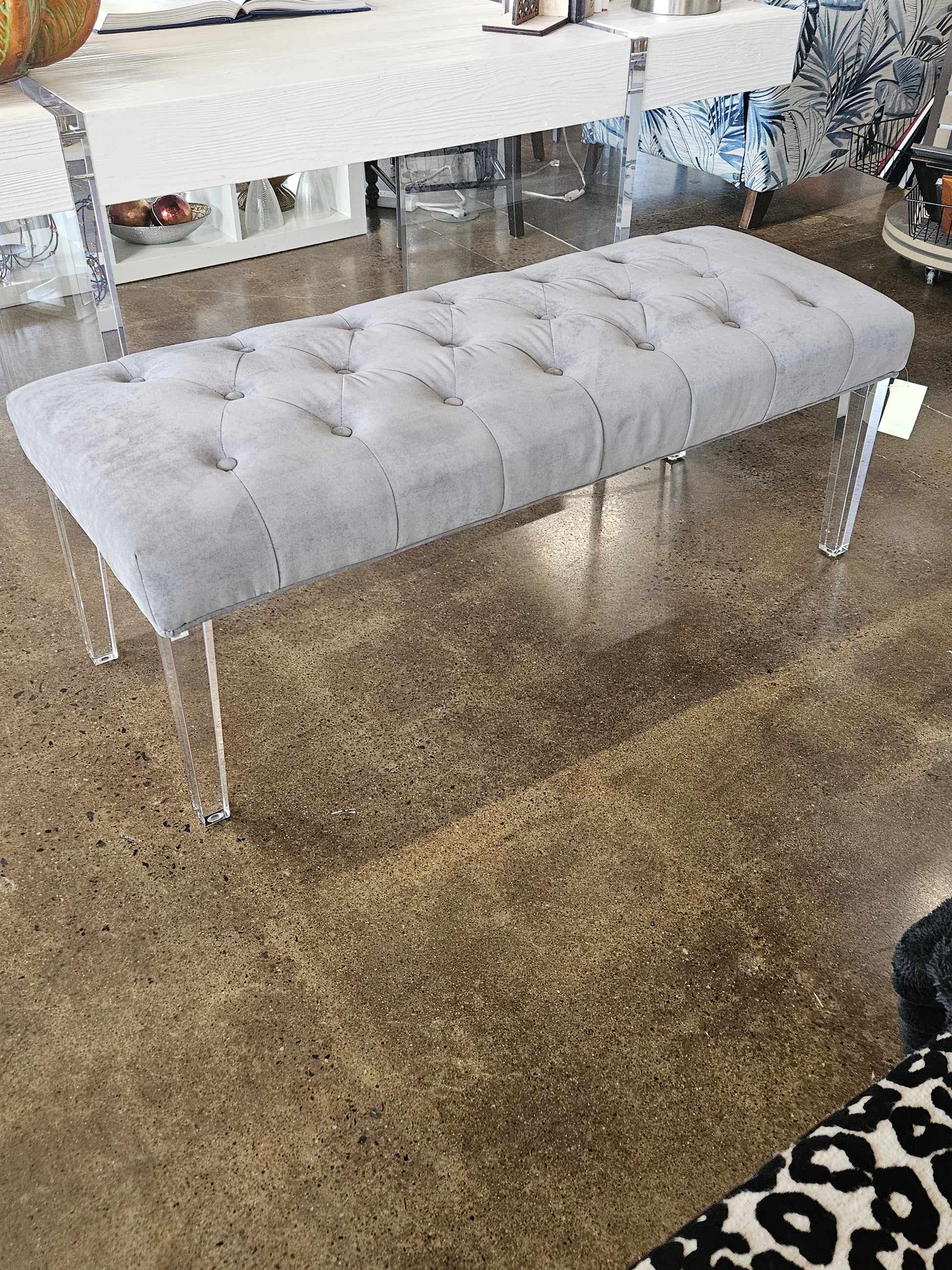 Gray Velvet Tufted Seat Bench/Clear Legs