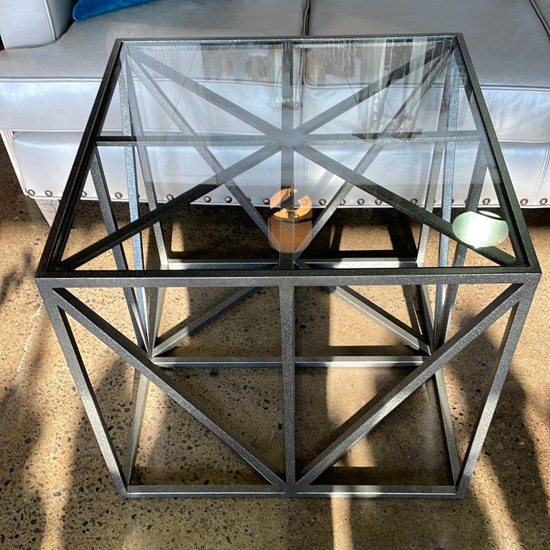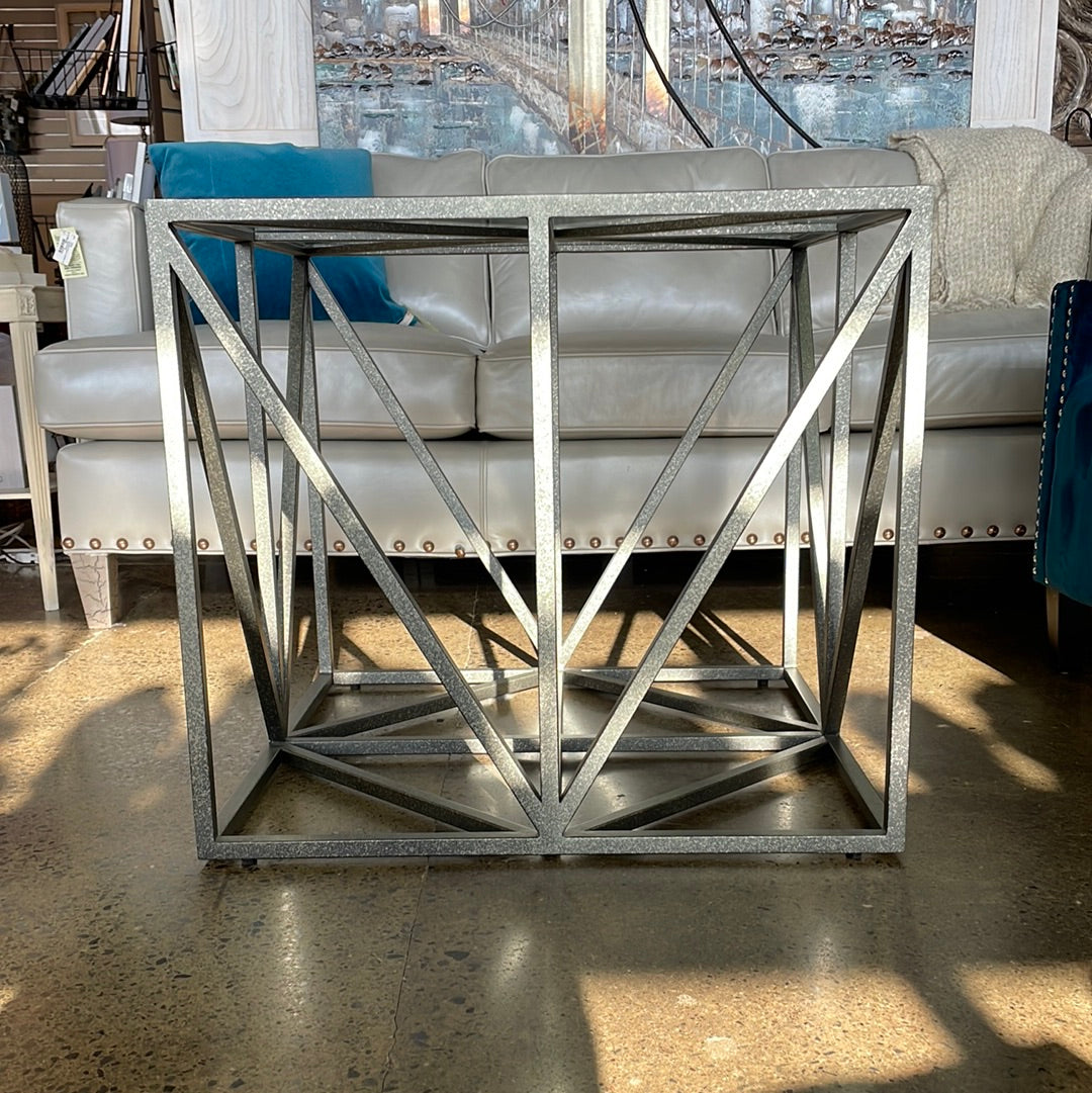 Grey and silver geometric metal glass top table. Use as a side table or coffee table.
