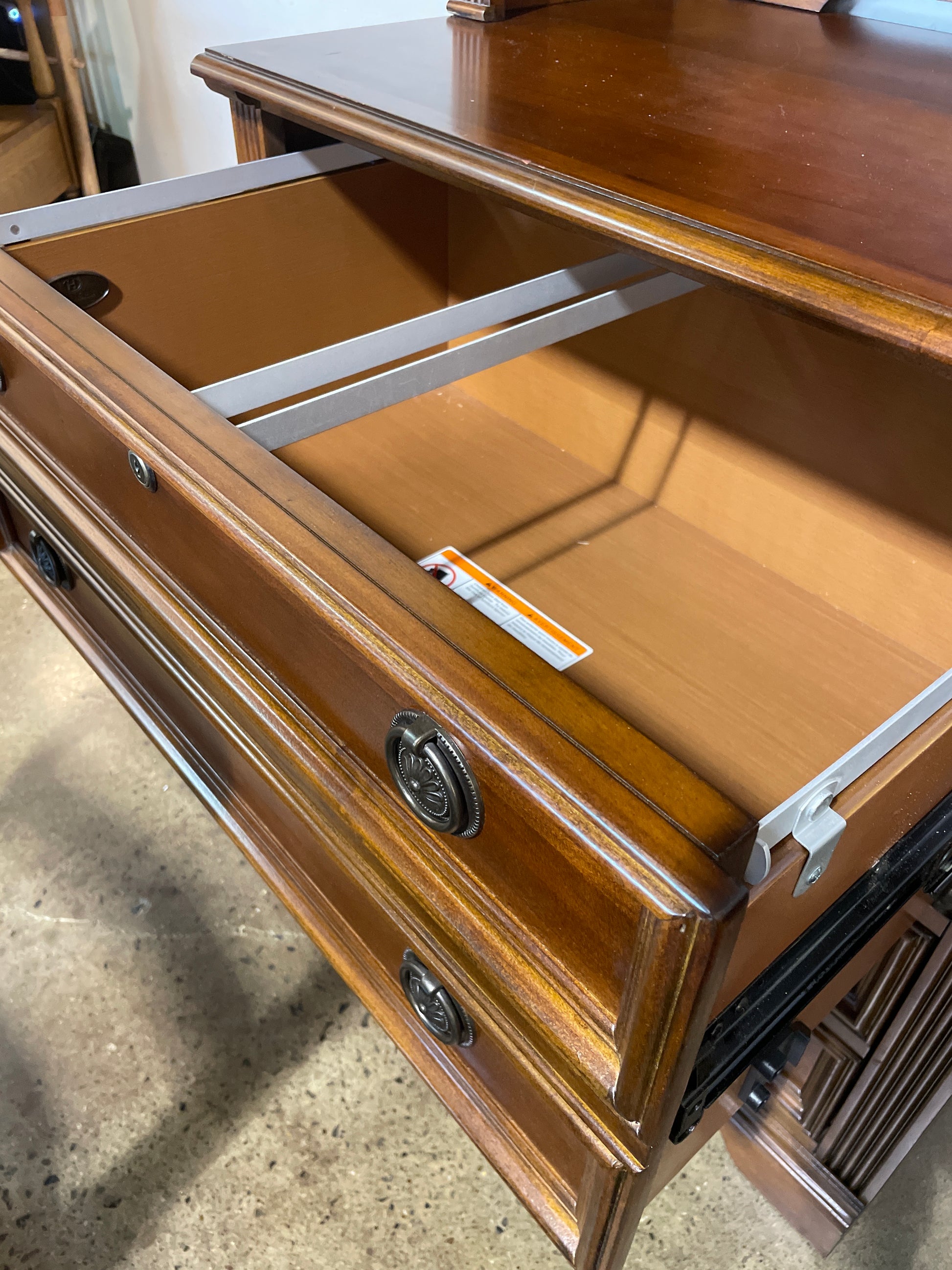 Stately, striking and stylish, the Brookhaven Lateral File is a class act that is packed with function. Timeless design details like a warm casual cherry finish and bronze-finished medallion-shaped ring-and-pull hardware combine with the storage features of two locking file drawers with a Pendaflex letter/legal file system on metal ball bearing slides, levelers and an anti-tilt mechanism. The Brookhaven Collection is crafted from hardwood solids with cherry veneers. It features a distressed medium clear cherry finish.