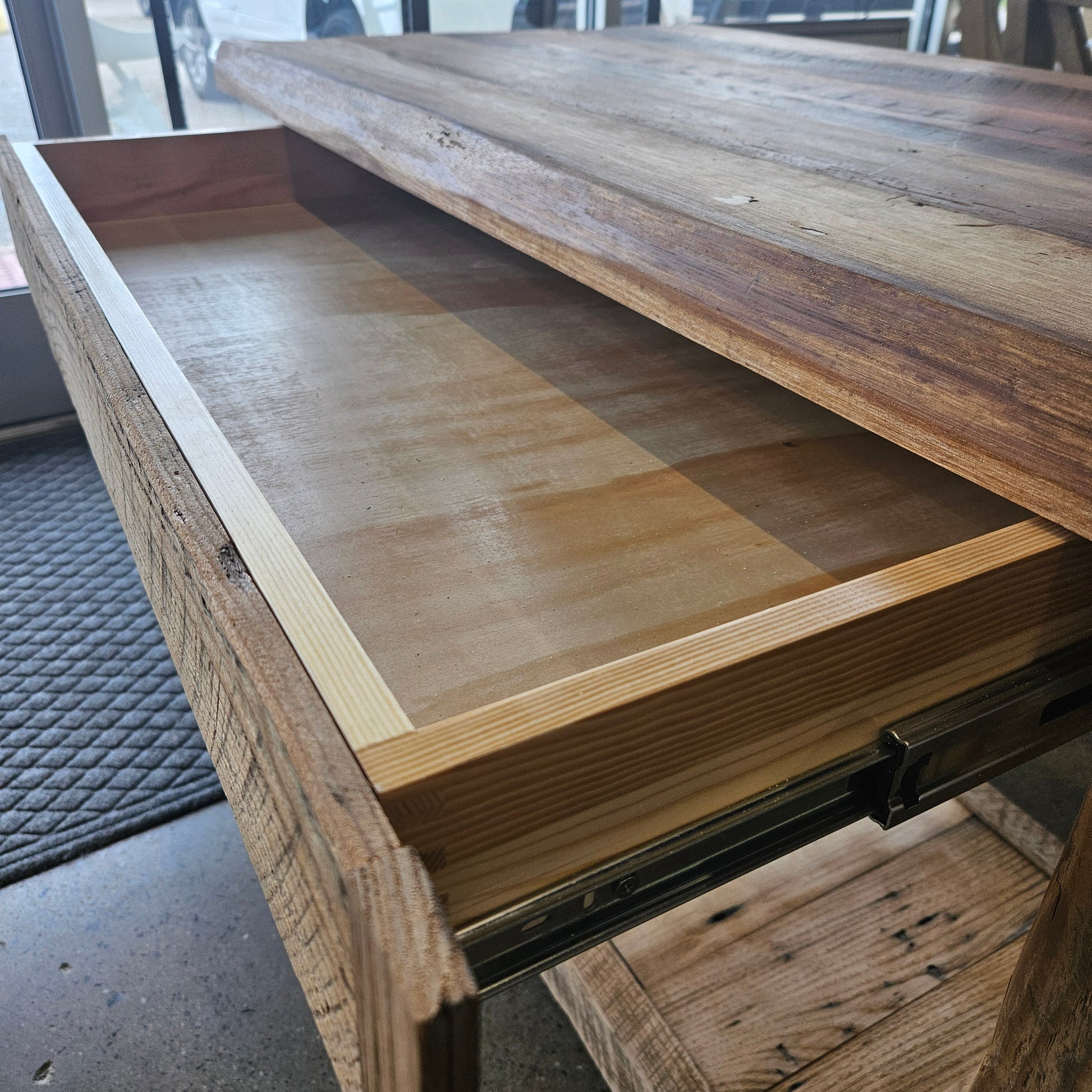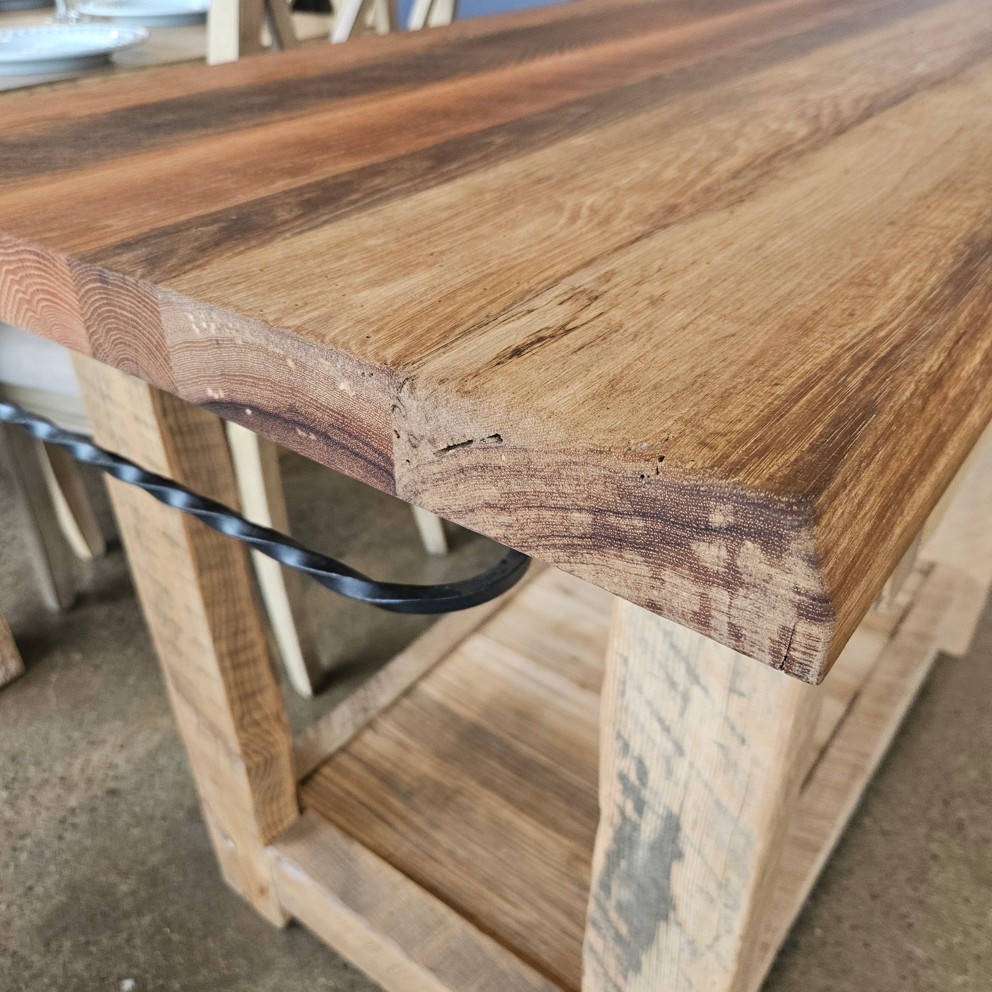 Handcrafted by a local artist, this kitchen island has tons of personality. Made with reclaimed wood, it has a butcher block top, long drawer and bottom shelf. Paper towel holder on one side and towel holder on the other.