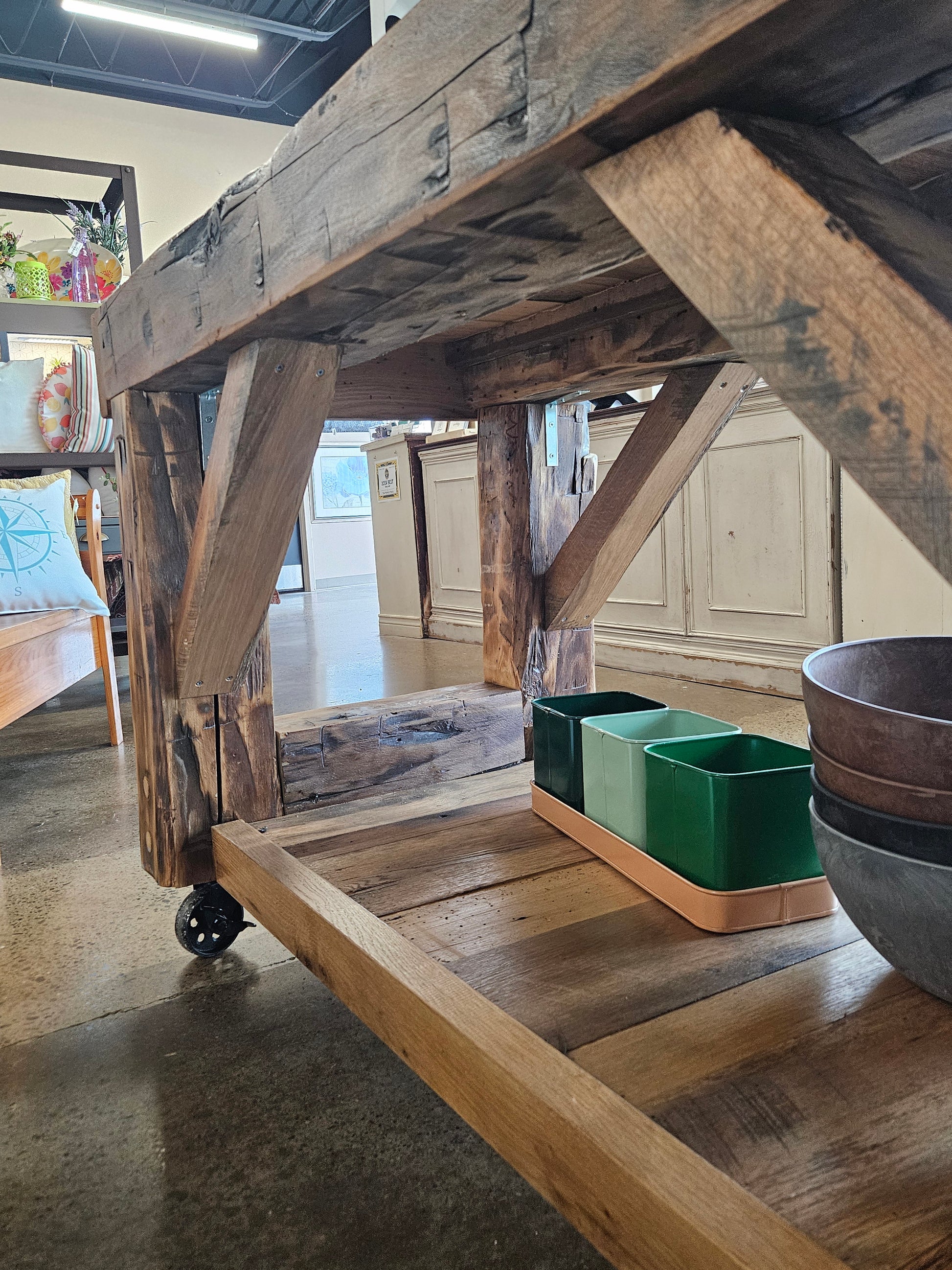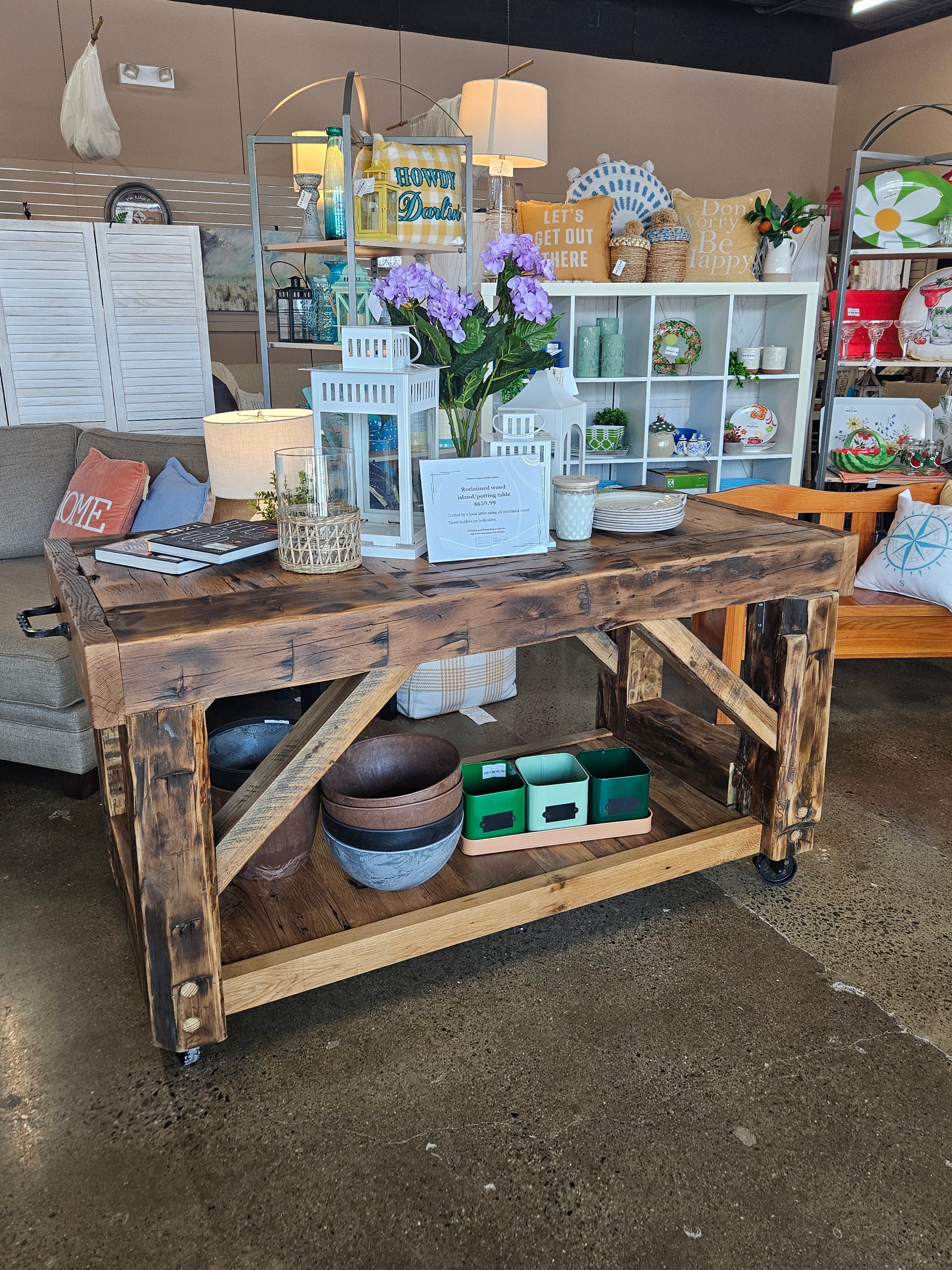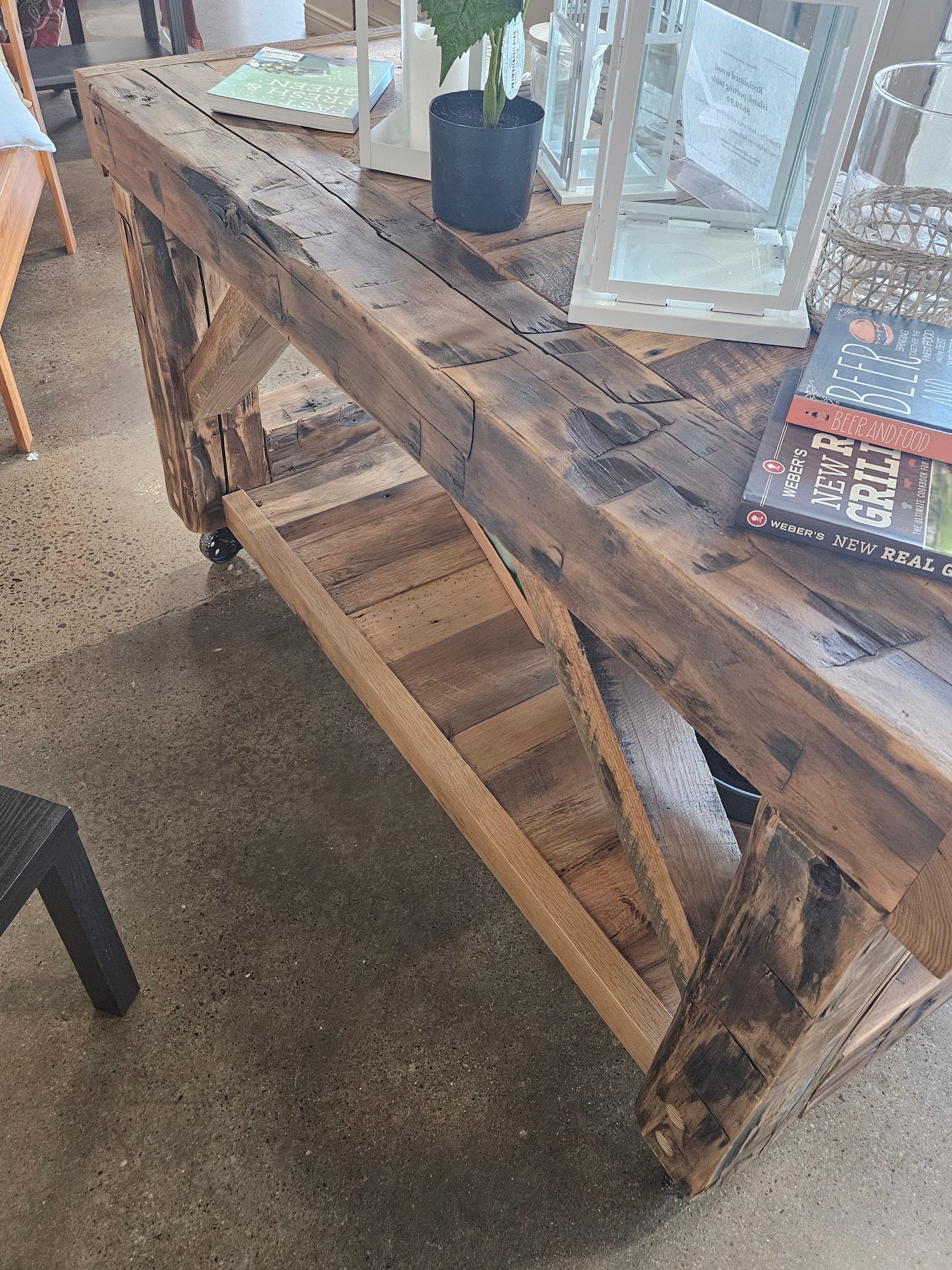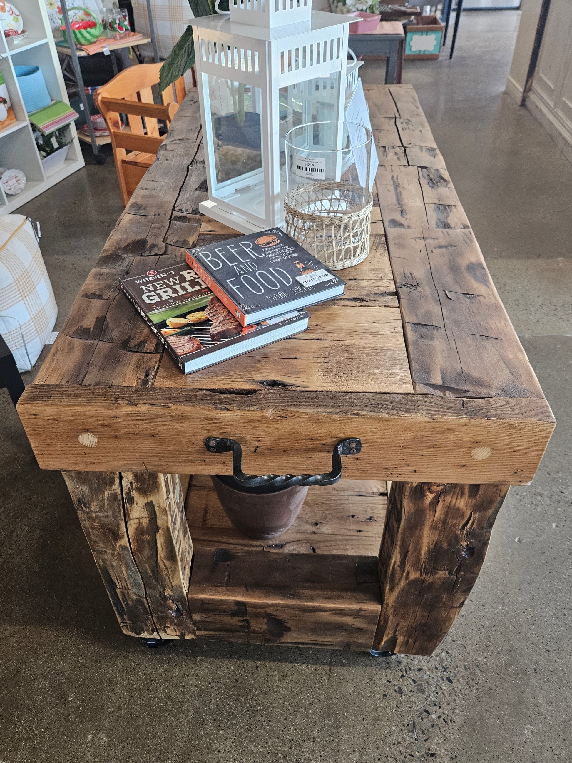 Crafted by a local artist from reclaimed wood, this item can be used in so many ways. Sides have towel holders with a bottom shelf.