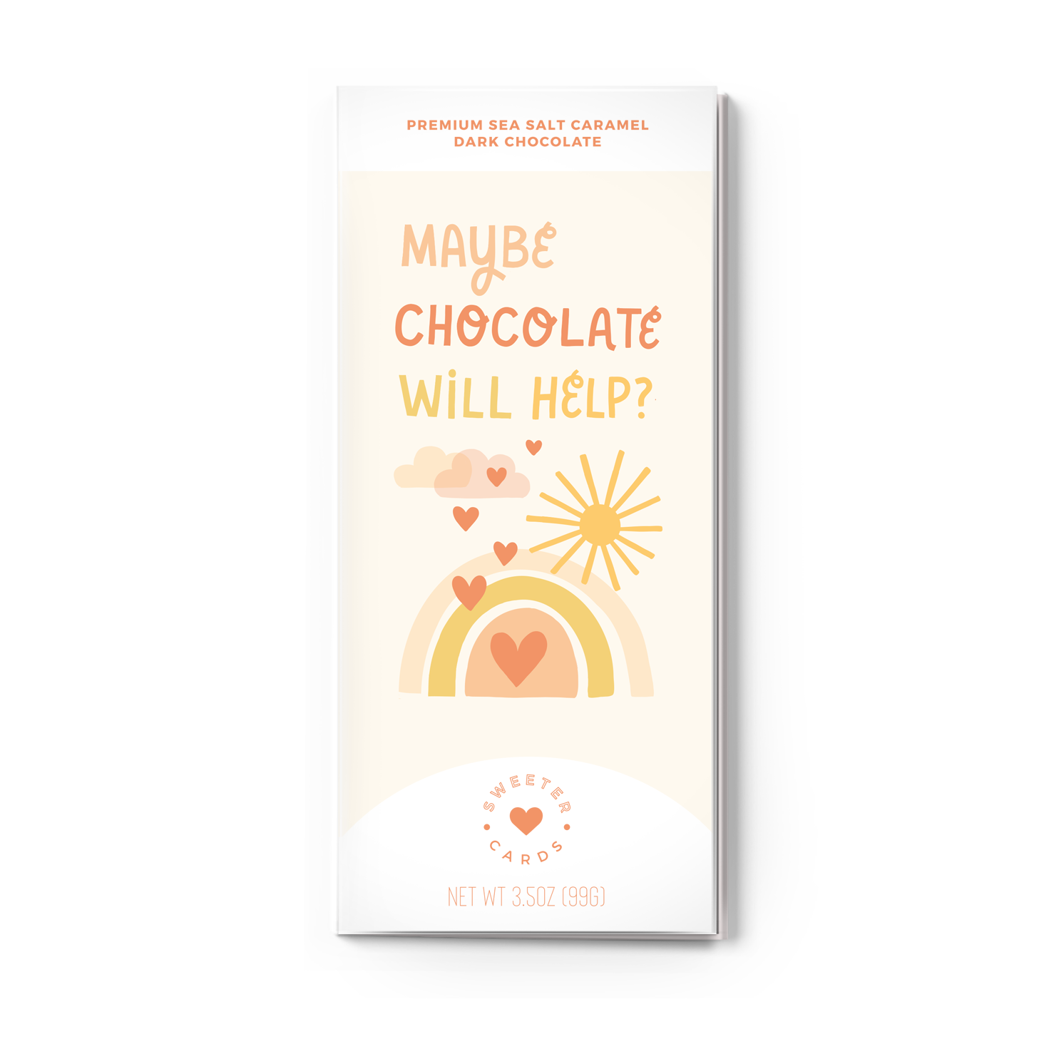 Meet our "Maybe Chocolate Will Help?" greeting card! Inside each festive Sweeter Card is an additional reason to celebrate–a gourmet chocolate bar waiting to be opened and devoured. Our sea salt caramel dark chocolate bar is fair trade certified and insanely delicious. Just check out our reviews–every single one of them is 5 stars and we have 175+ of them! This card is great for thinking of you, grievance, get well soon, sympathy and more.