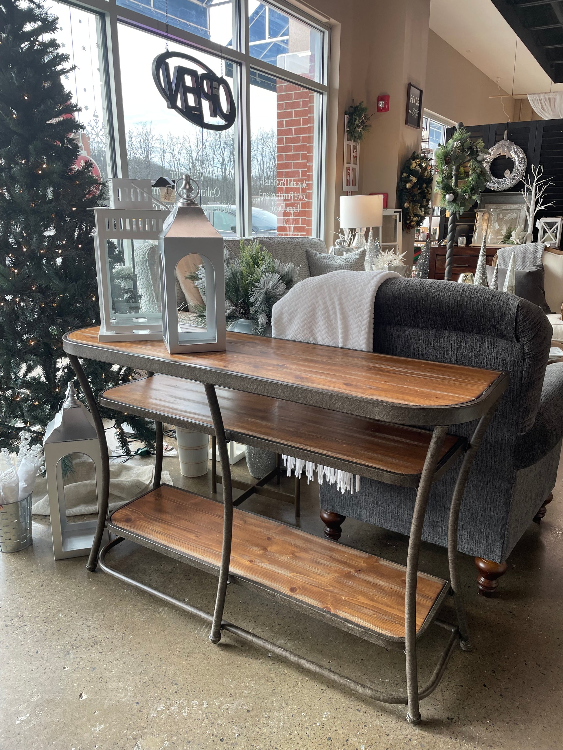 Make the most of your space with the Nartina sofa table. Designed to nestle behind a sofa or up against the wall, the table offers three levels of display in varying heights—perfect for showing off accents of every height. A rustic mix of metal and wood highlight the curving profile.