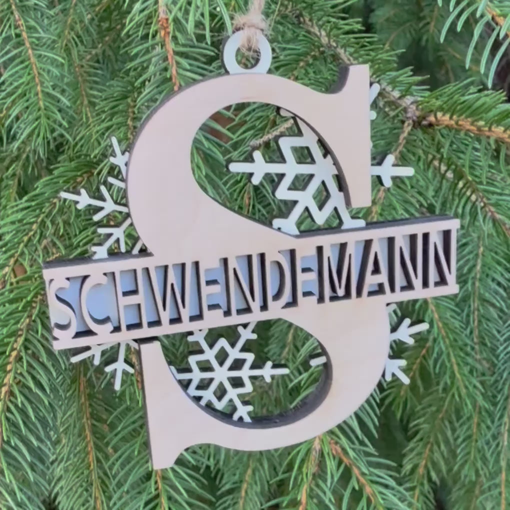 The Back layer will be white snowflake cutouts and the top layer will be personalized with a last name!