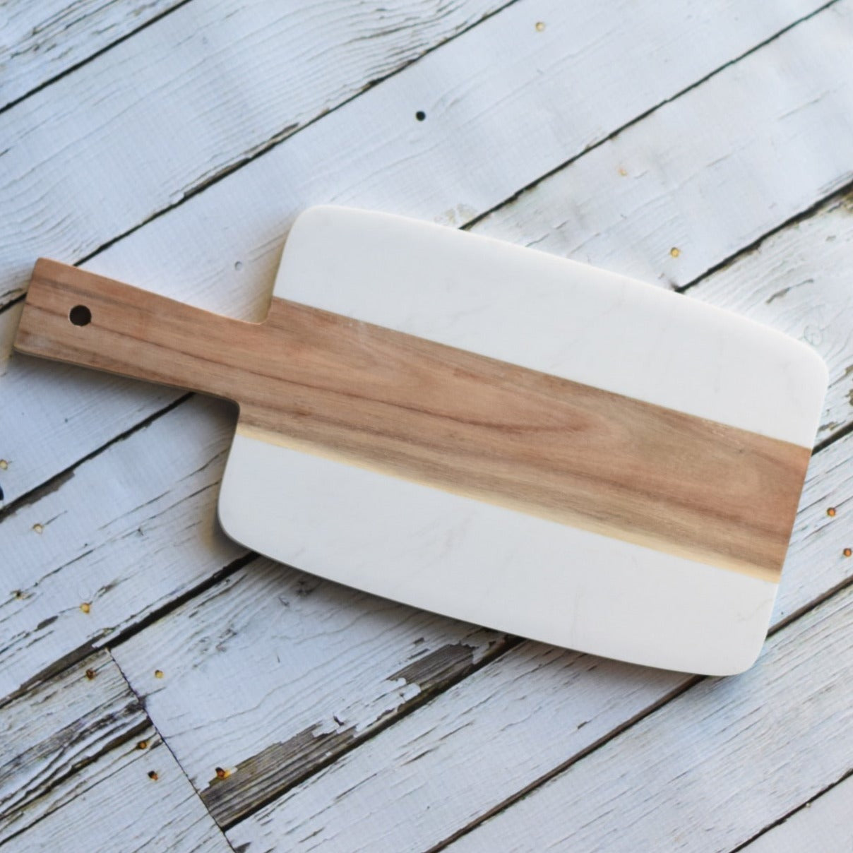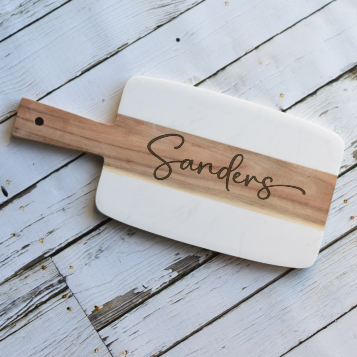 Participants will receive a marble/wood acacia board that measures 10 1/2" x 7 1/2" with the option to personalize your board with a last name or leave it blank.