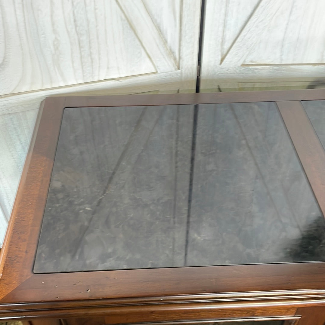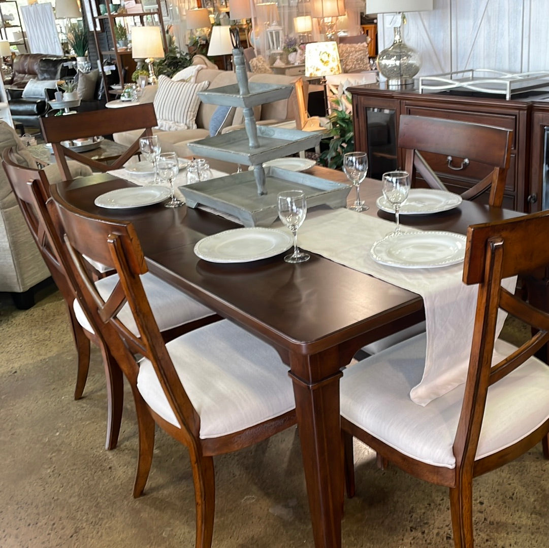 Dining room table with 18" leaf, 6 chairs, and marble topped buffet