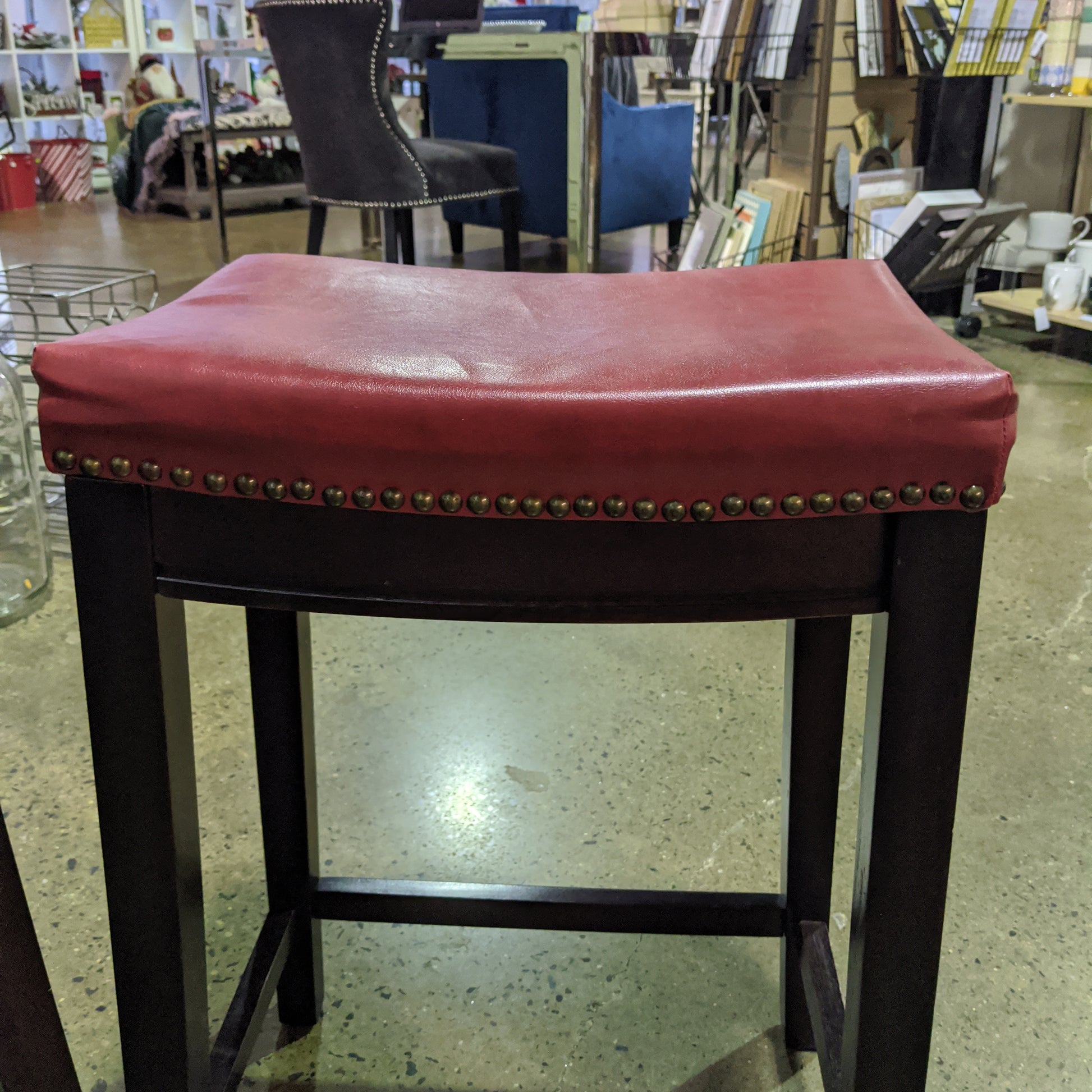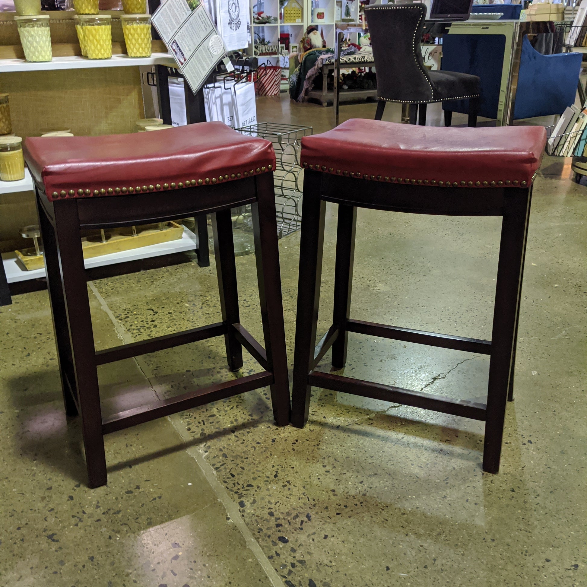 Set of 2 counter height stools with red leather like fabric and brass nailheads.