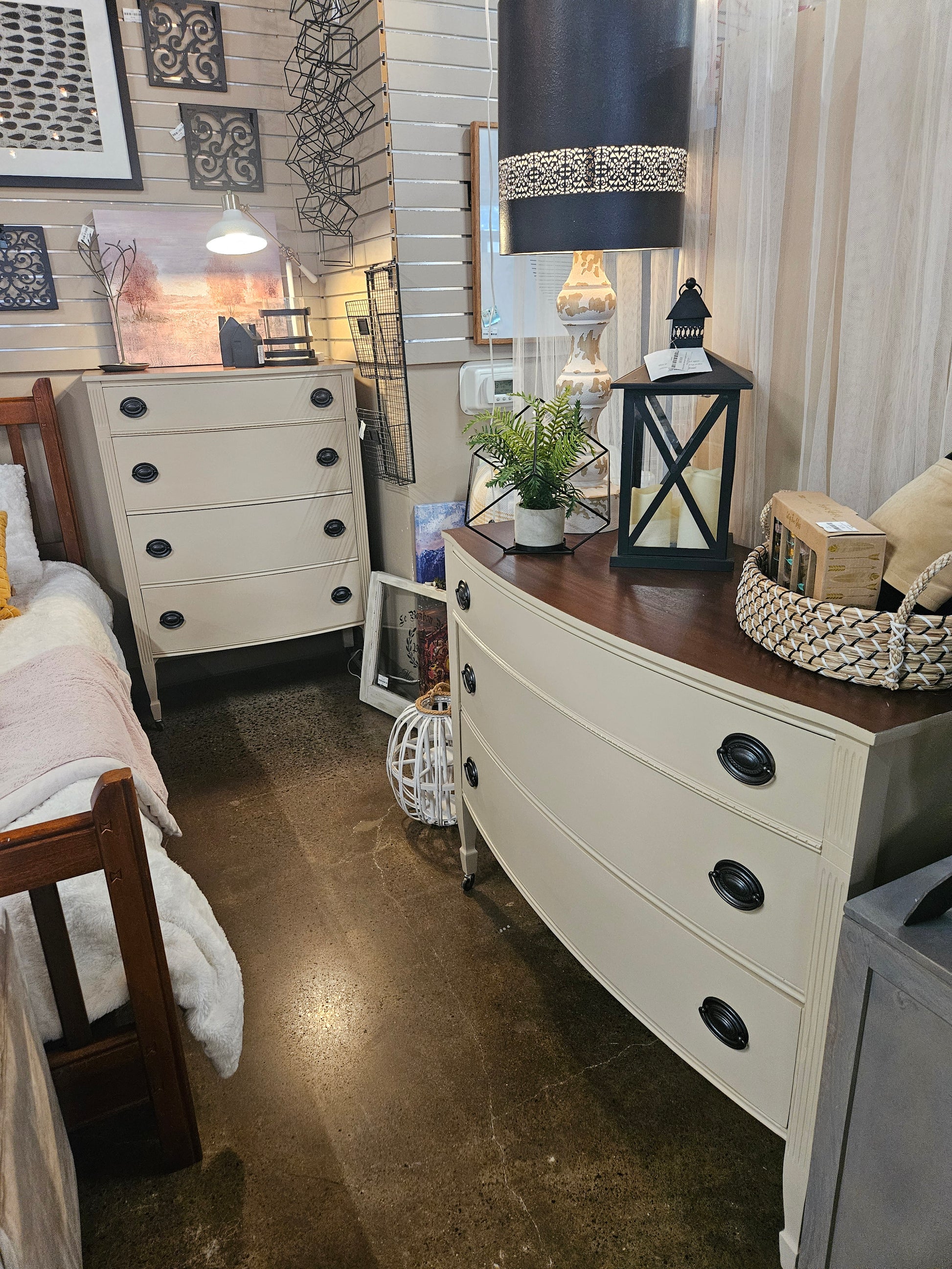 Refinished by a local artist in Linen Wise Owl Enamel Paint. Top wood tones, base cream/linen. Drawers lined.