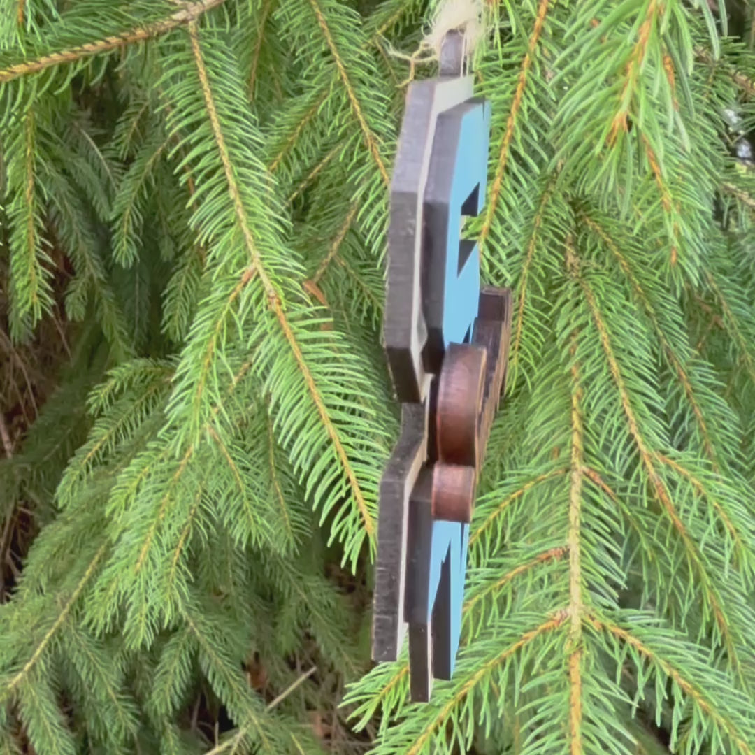 This is a three layer ornament. The back layer is white, the middle layer is a light blue SV and the top layer is "Seneca Valley" cut out of natural wood.