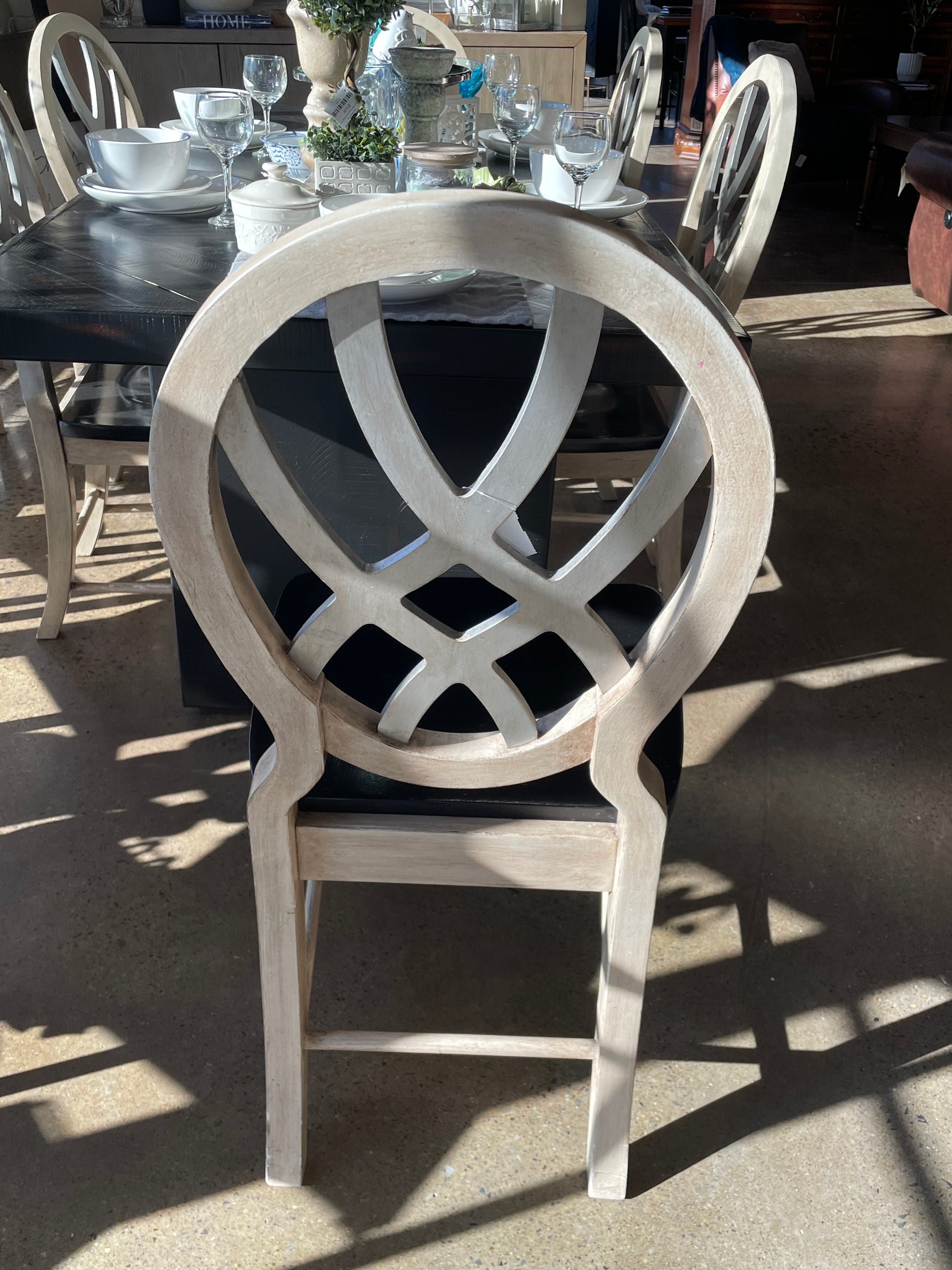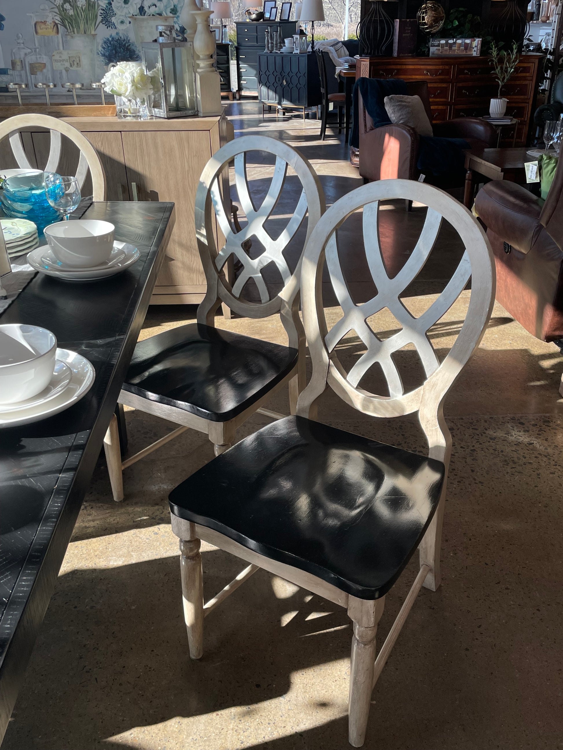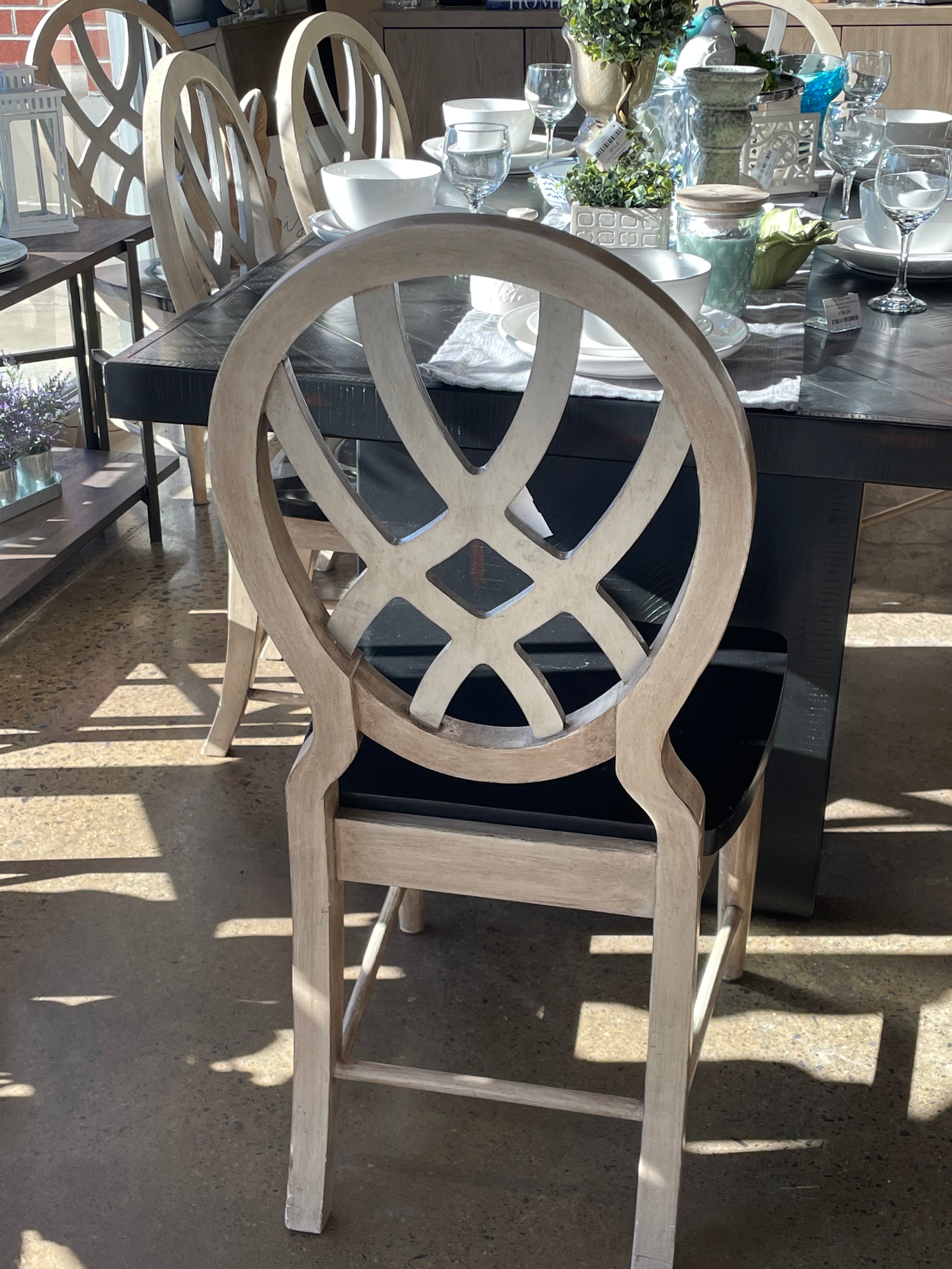 Feature black seats, neutral legs and edges, silver decorative painted back
