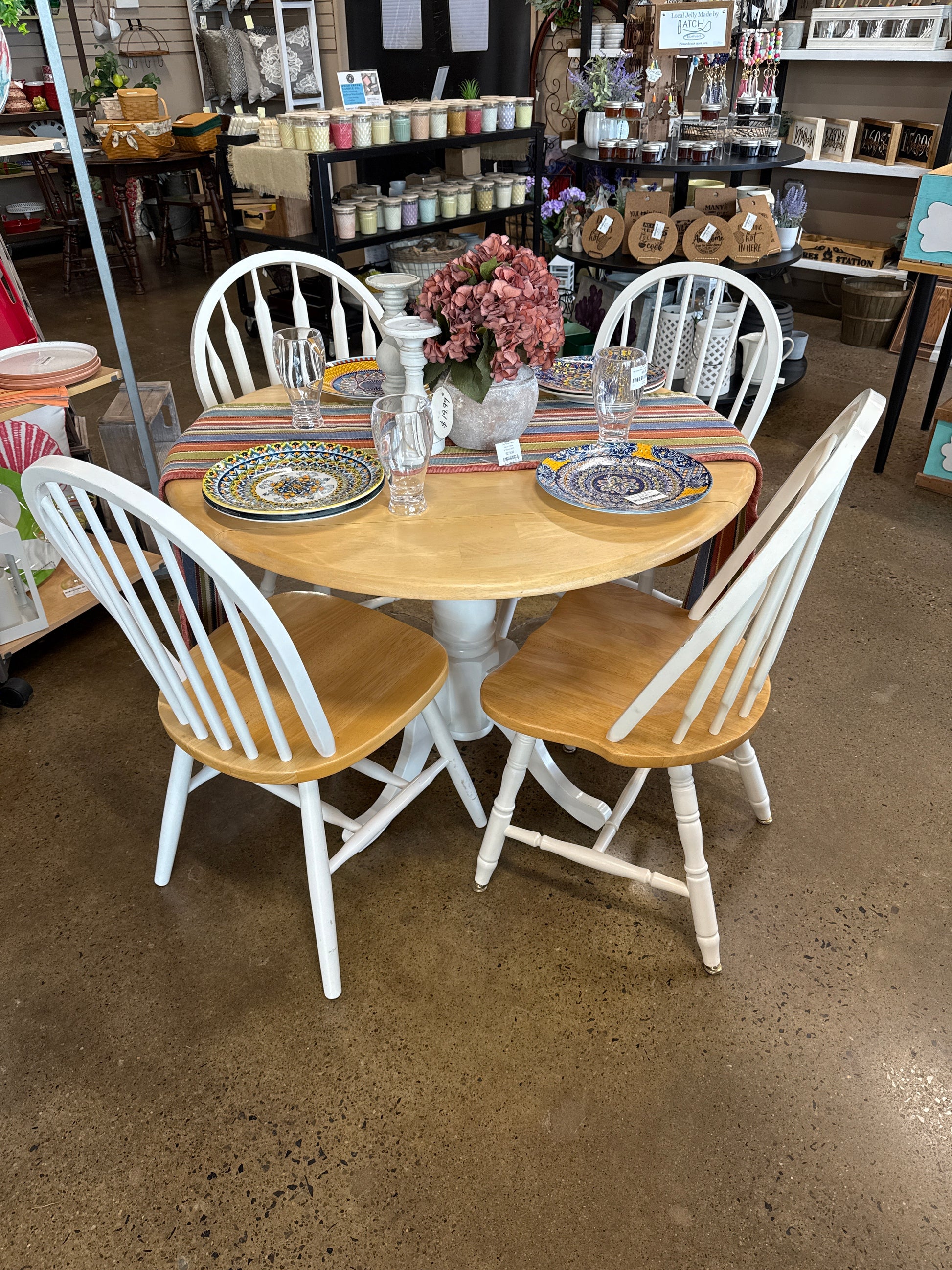 Features a light colored wood on the seats of the four chairs and table top and a white painted table base and chair legs.