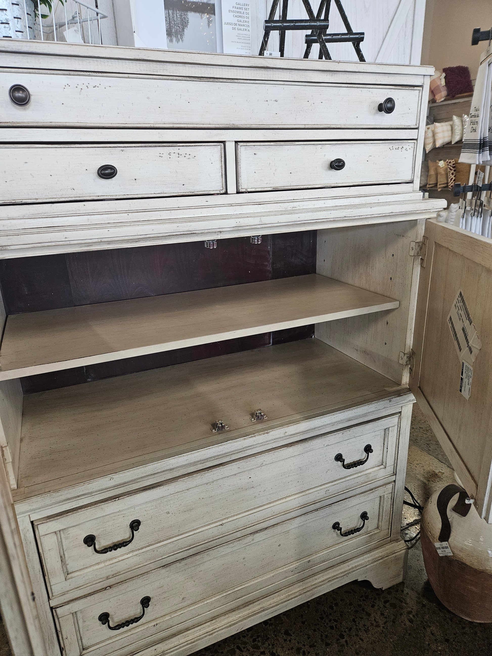 5 drawers and 2 doors with a shelf inside