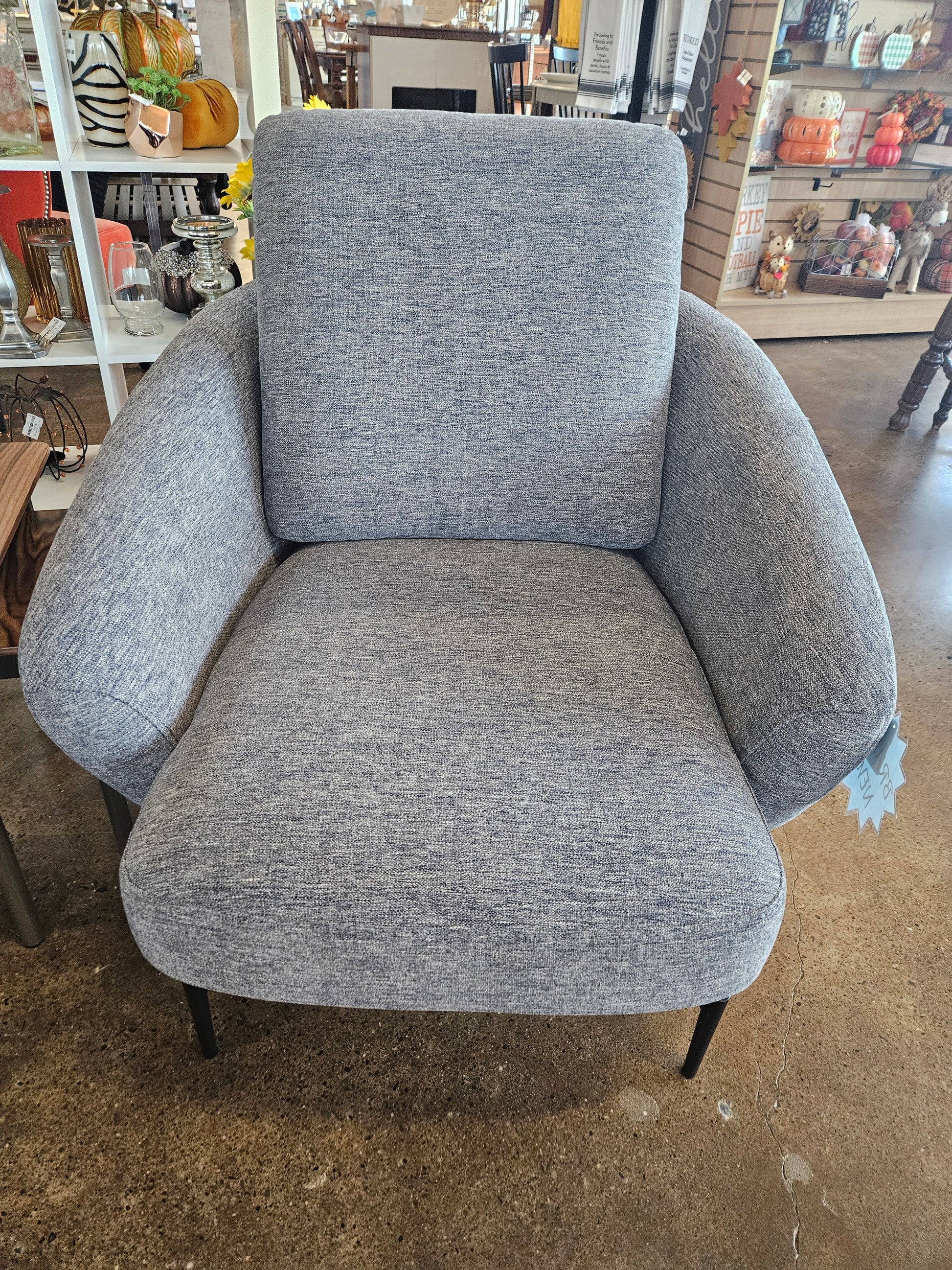 Nill’s armchair in soft light grey upholstery with rounded, enveloping arms and backrest. Supported by sleek, black metal legs with a Y-shaped profile, the chair combines comfort with modern minimalism.